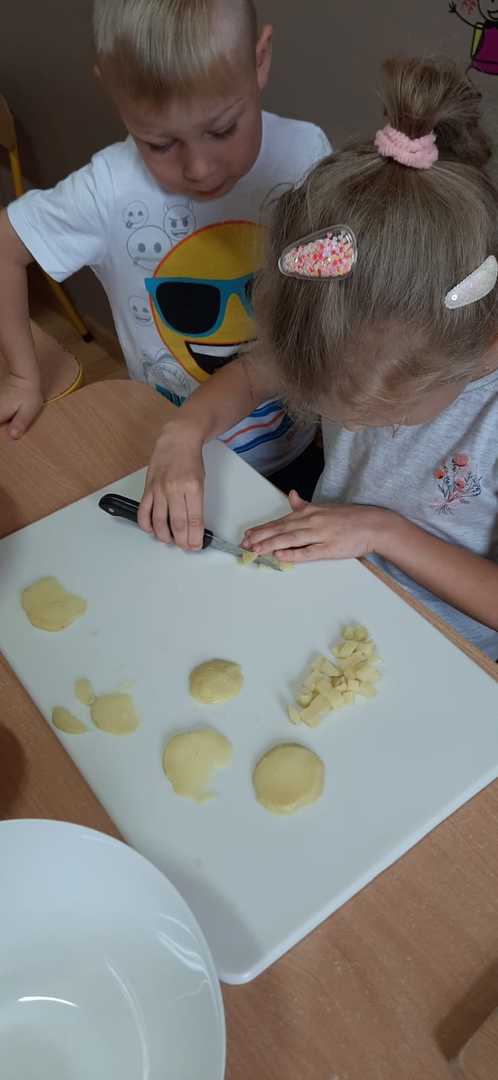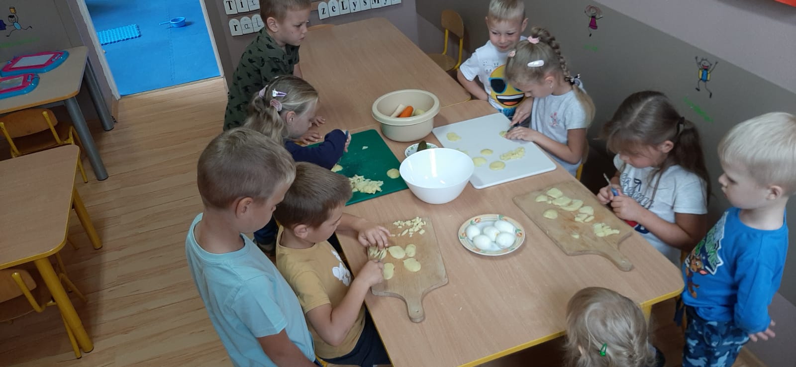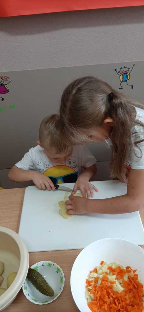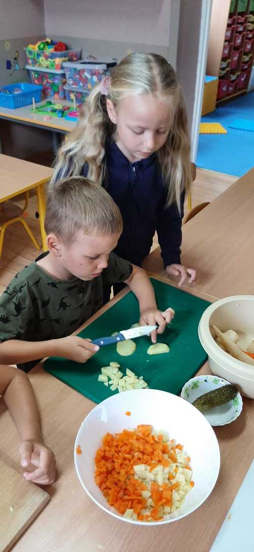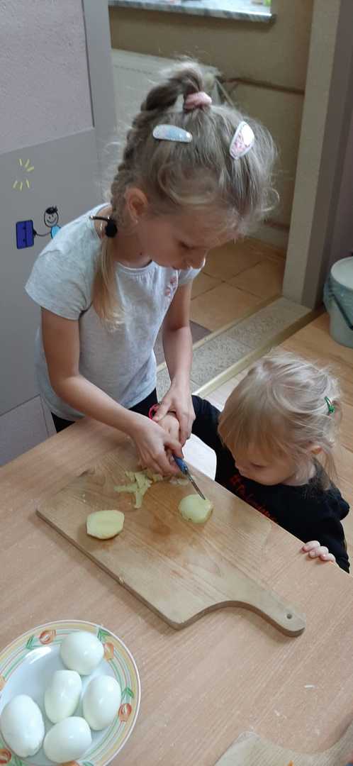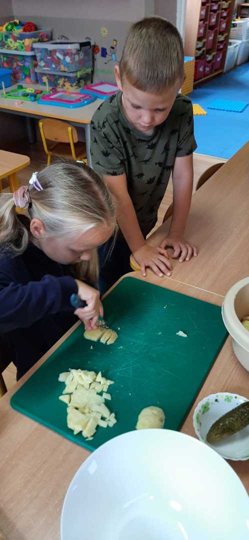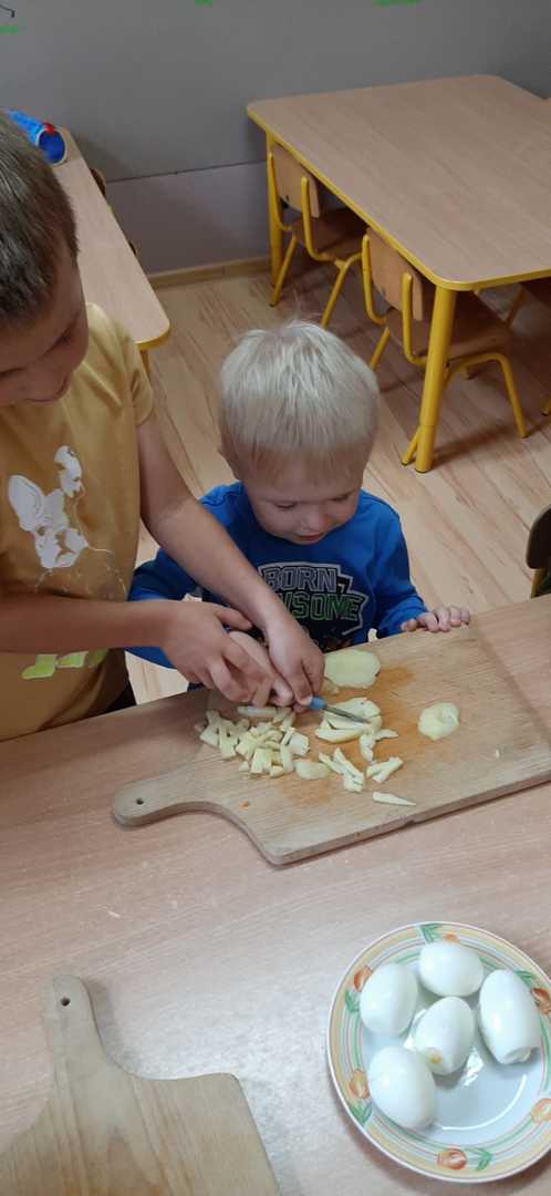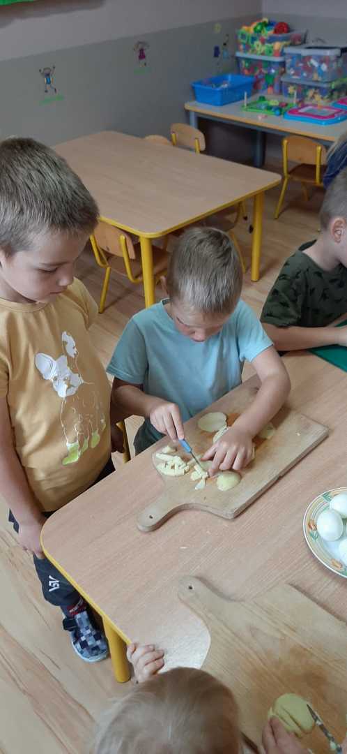 Na zajęciach przygotowaliśmy sałatkę jarzynową. Najpierw maluchy podpatrywały starszaków, którzy doskonale radzą sobie z krojeniem w kostkę, a następnie pod czujnym okiem kolegów i koleżanek maluszki poradziły sobie znakomicie! Uff... Praca- pracą, ale smakowało wyśmienicie. Mniam!!!