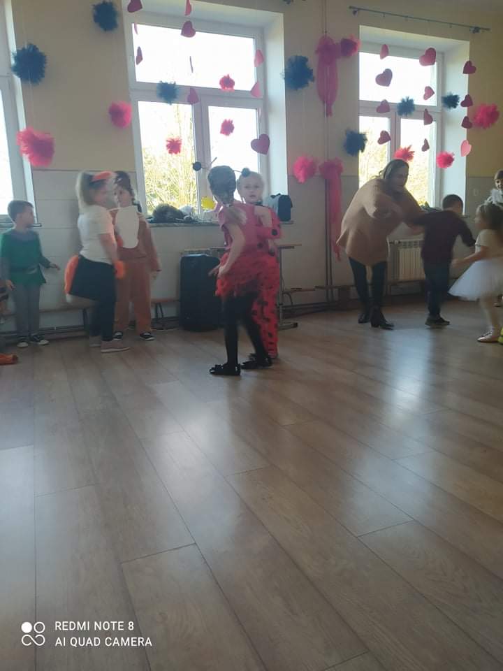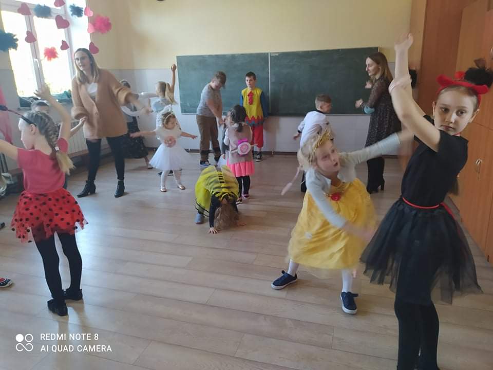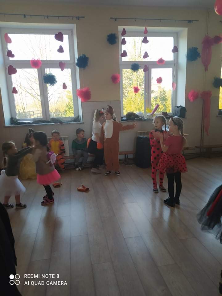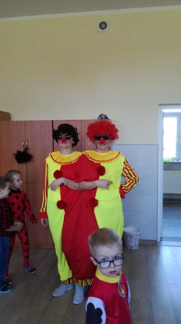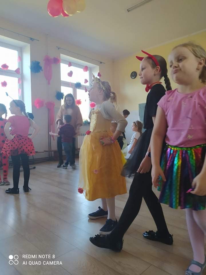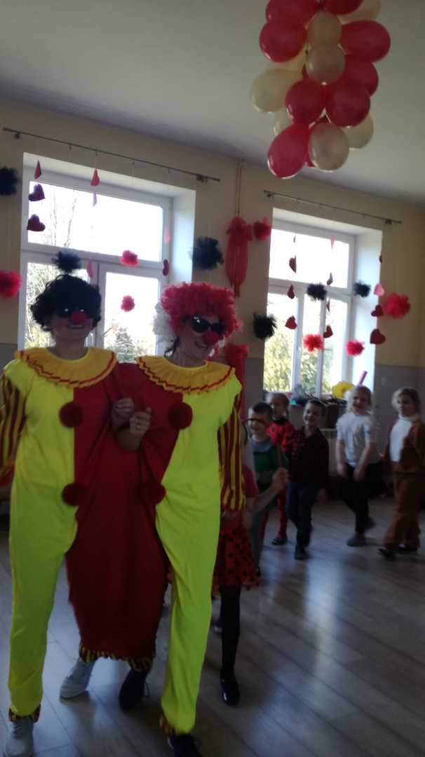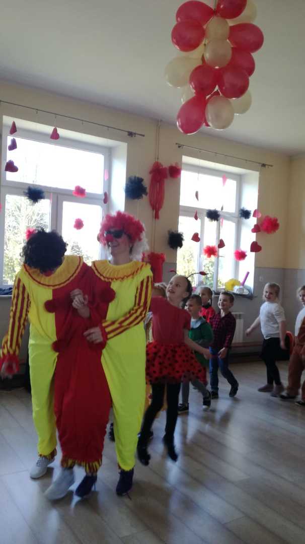 W przedszkolu już od rana przybywało kolorowych postaci- bohaterów z bajek, księżniczek, astronautów oraz wielu innych postaci. Wystrój sali balowej nawiązywał do Walentynek i zachęcił dzieci do miłej zabawy. Głównymi bohaterami naszej zabawy karnawałowej były dwa klauny, które porwały dzieci w rytm muzyki!Dzieci świetnie się bawiły uczestnicząc ze swoimi Paniami w zabawie