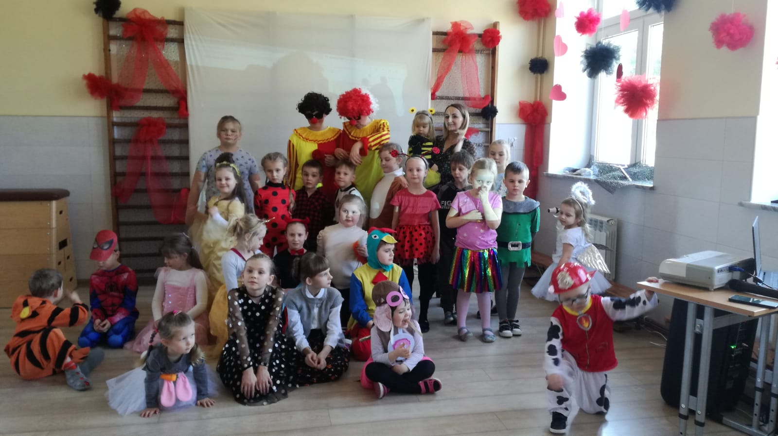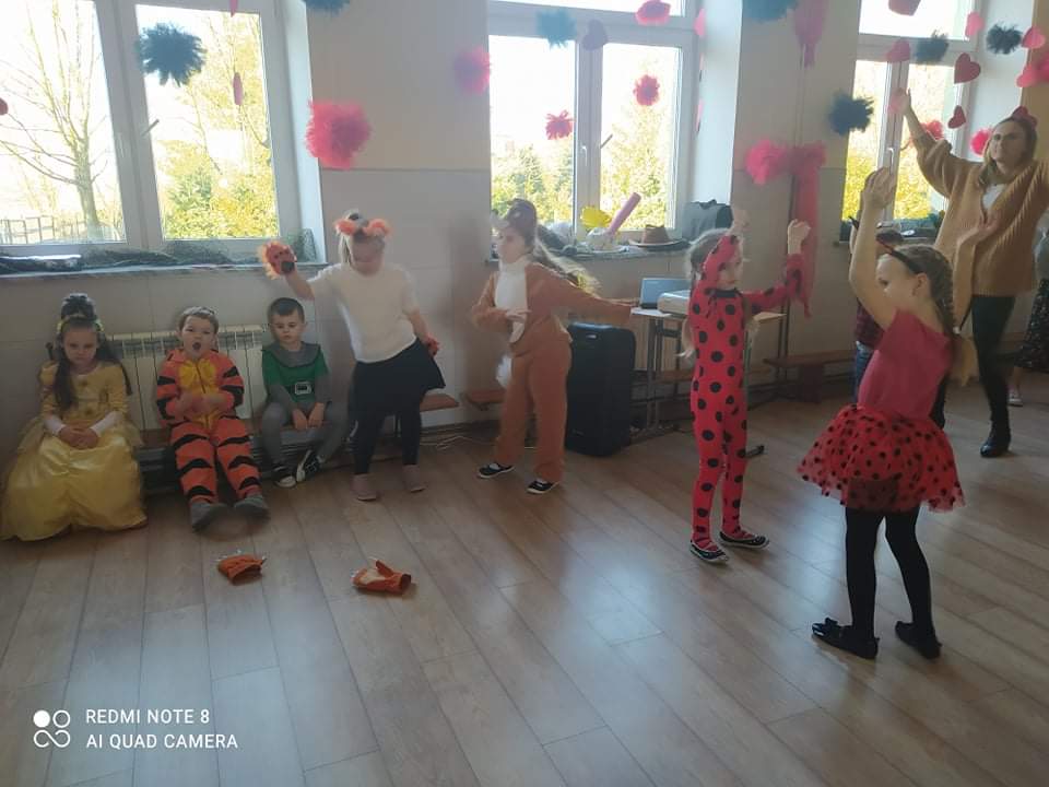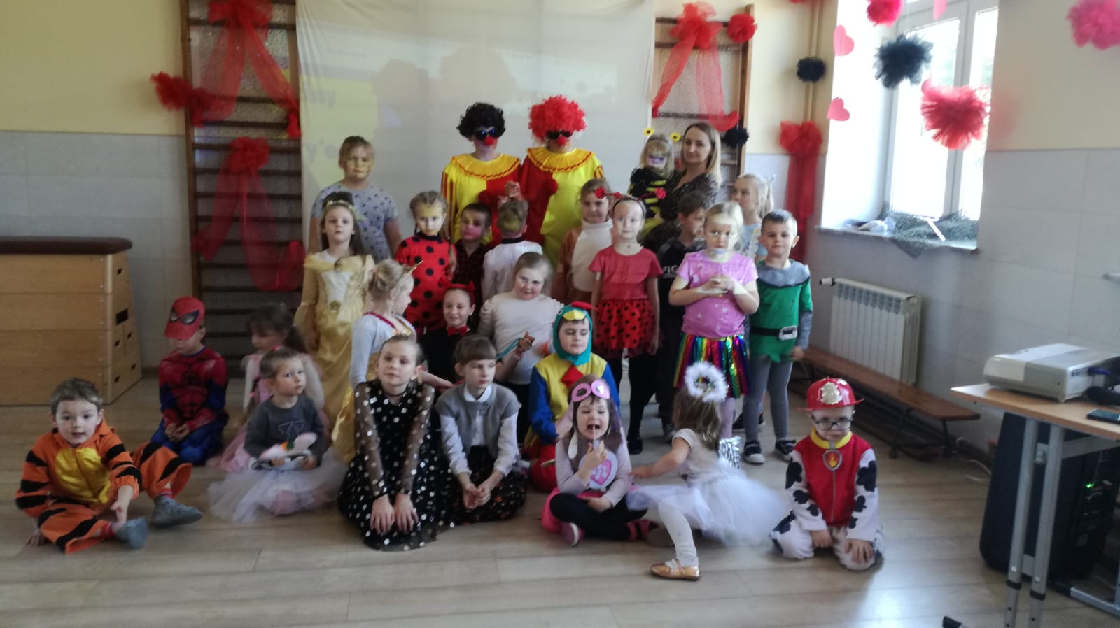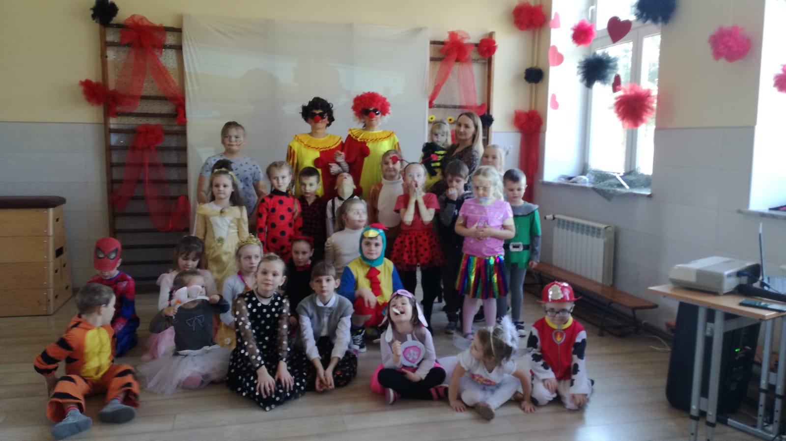W przedszkolu już od rana przybywało kolorowych postaci- bohaterów z bajek, księżniczek, astronautów oraz wielu innych postaci. Wystrój sali balowej nawiązywał do Walentynek i zachęcił dzieci do miłej zabawy. Głównymi bohaterami naszej zabawy karnawałowej były dwa klauny, które porwały dzieci w rytm muzyki!Dzieci świetnie się bawiły uczestnicząc ze swoimi Paniami w zabawie