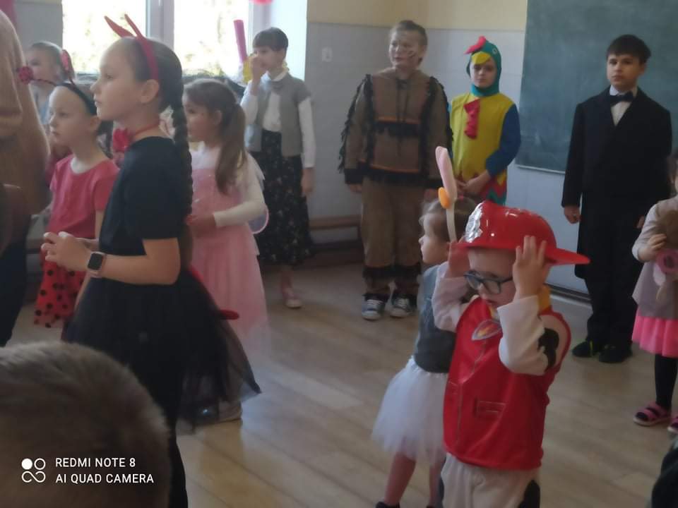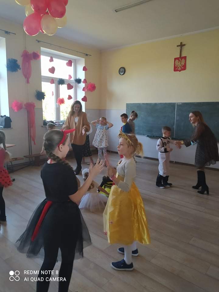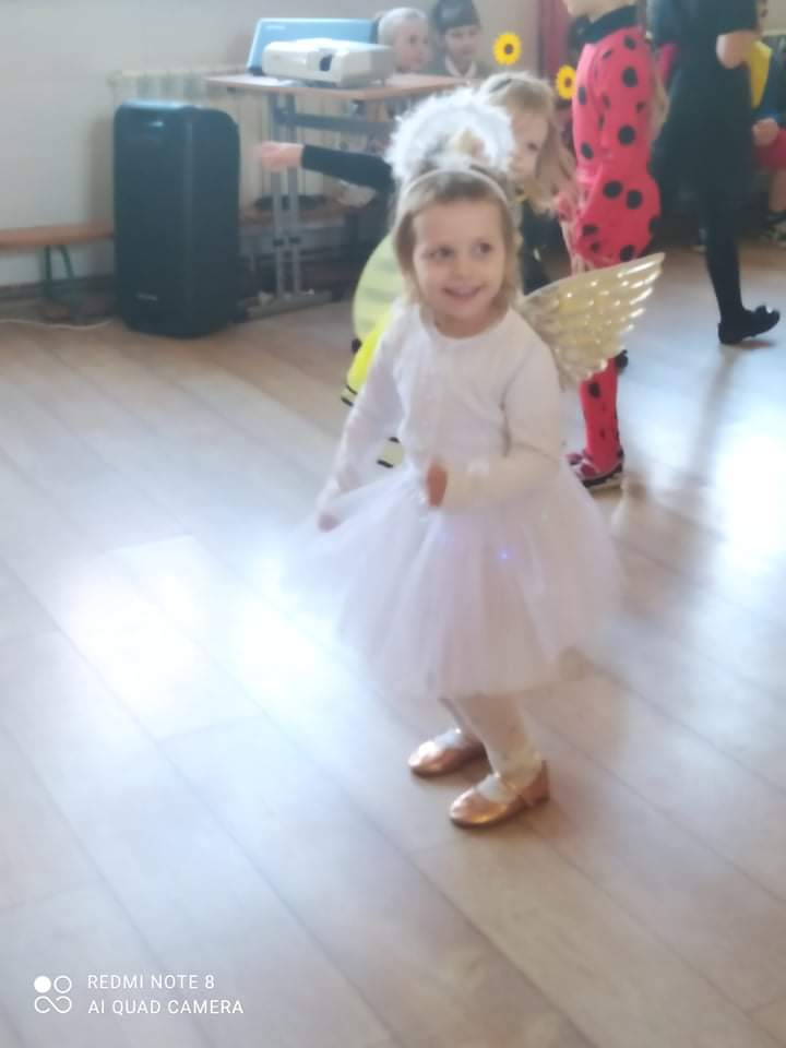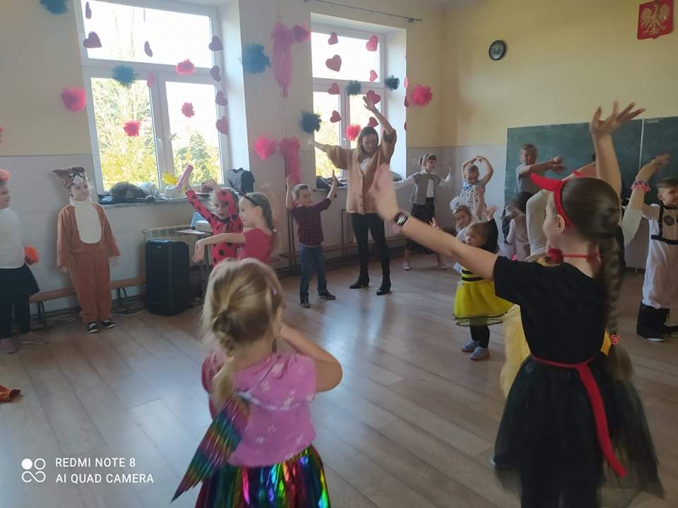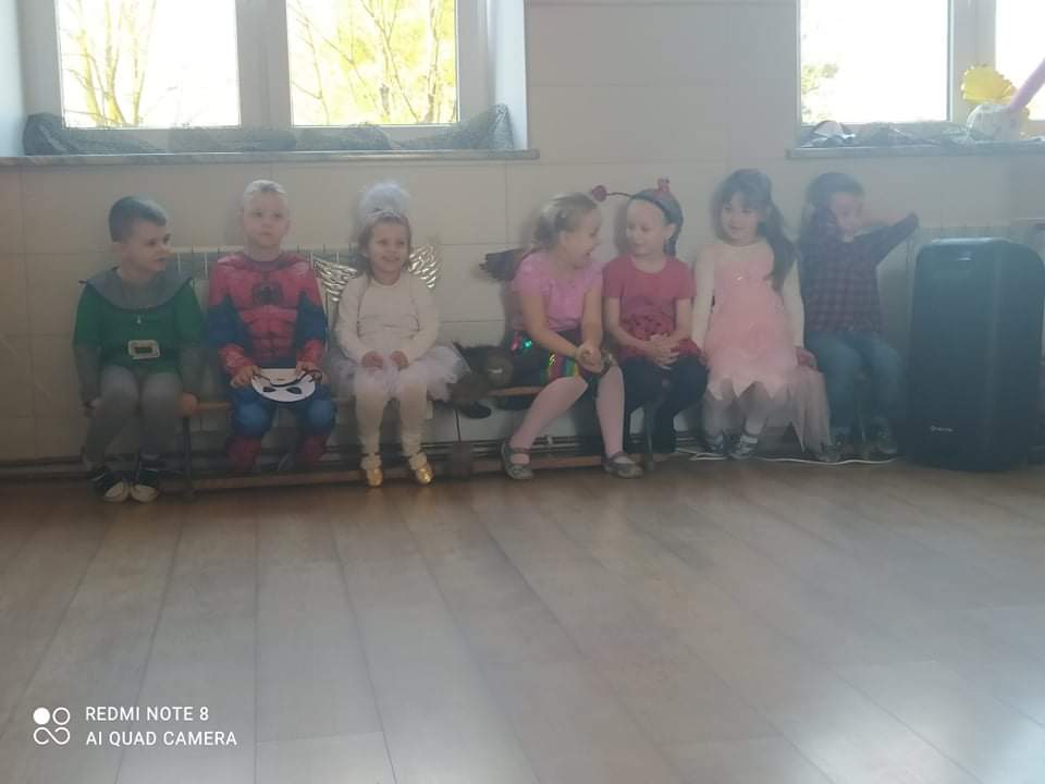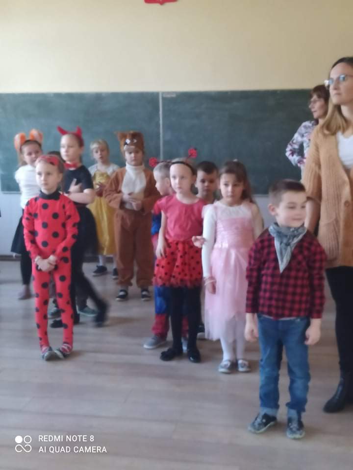 W przedszkolu już od rana przybywało kolorowych postaci- bohaterów z bajek, księżniczek, astronautów oraz wielu innych postaci. Wystrój sali balowej nawiązywał do Walentynek i zachęcił dzieci do miłej zabawy. Głównymi bohaterami naszej zabawy karnawałowej były dwa klauny, które porwały dzieci w rytm muzyki!Dzieci świetnie się bawiły uczestnicząc ze swoimi Paniami w zabawie