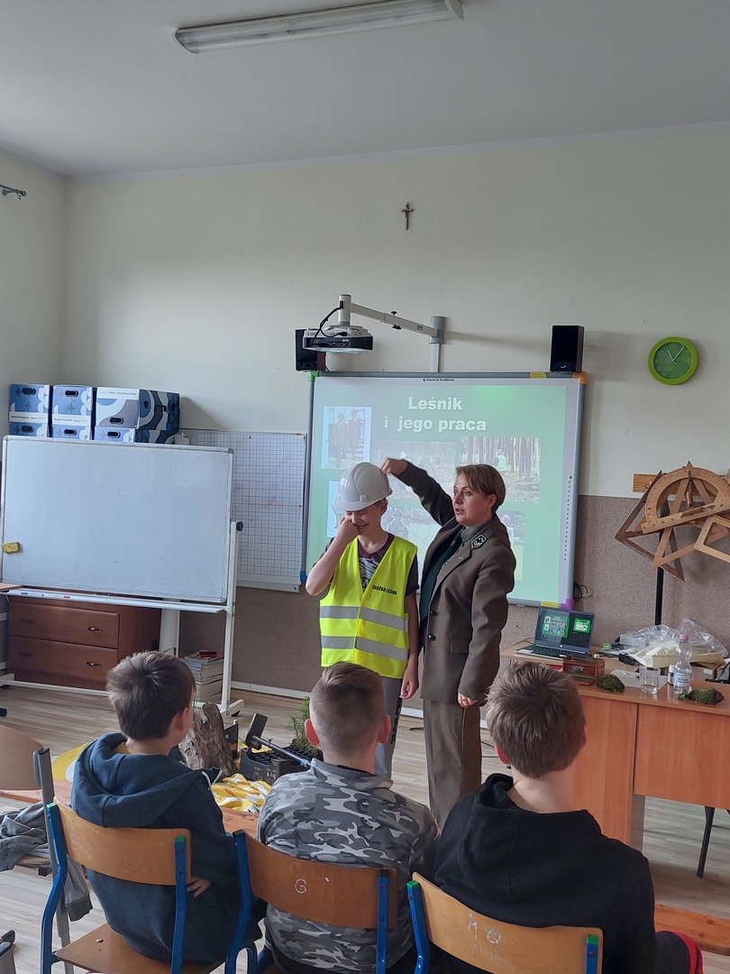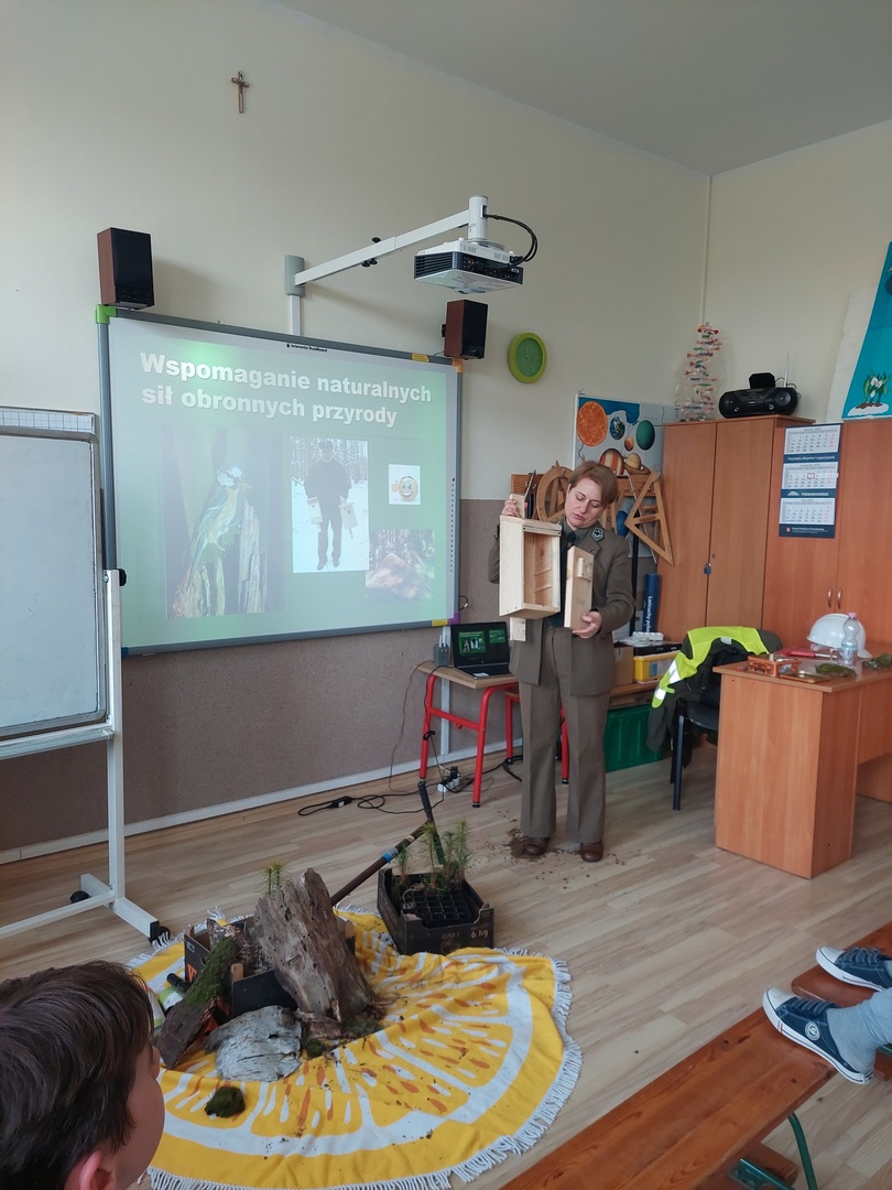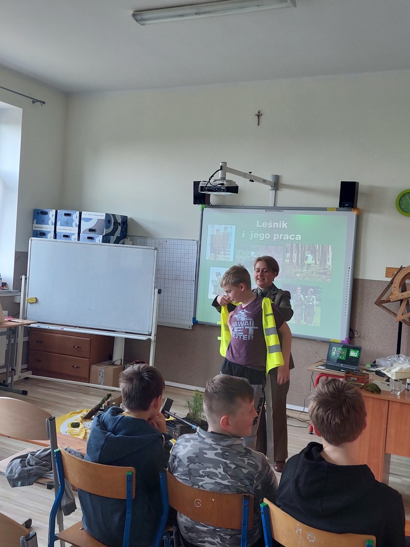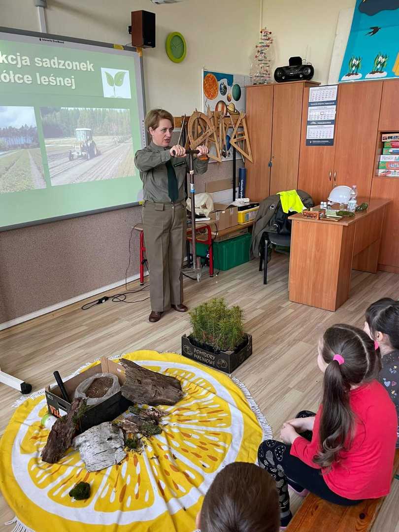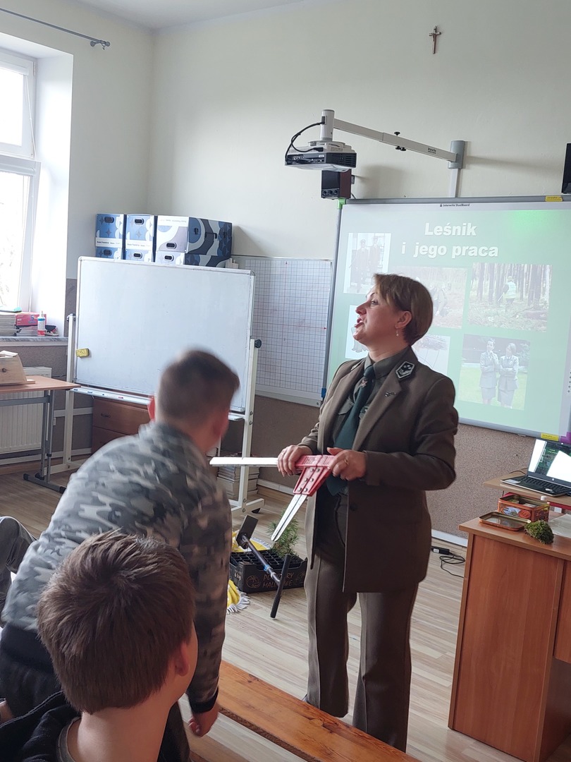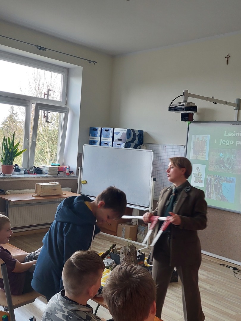 7 kwietnia 2022r. odwiedziła nas Pani Aleksandra Radomska- Barton z Leśnego Zakładu Doświadczeń w Siemianicach, która z wielkim entuzjazmem opowiedziała nam o swojej pracy- leśnika. Poznaliśmy zadania, które wykonuje na co dzień. Rozmawialiśmy również o zagrożeniach, które stwarza człowiek oraz o sposobach uniknięcia ich. Dowiedzieliśmy się także,że praca Pani Aleksandry jest Jej ogromną pasją i wykonuje ją z wielkim zaangażowaniem. Praca leśnika jest bardzo potrzebna i odpowiedzialna dla lasu oraz pośrednio dla nas.