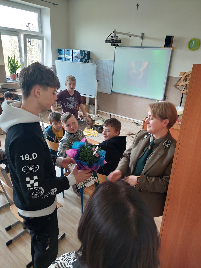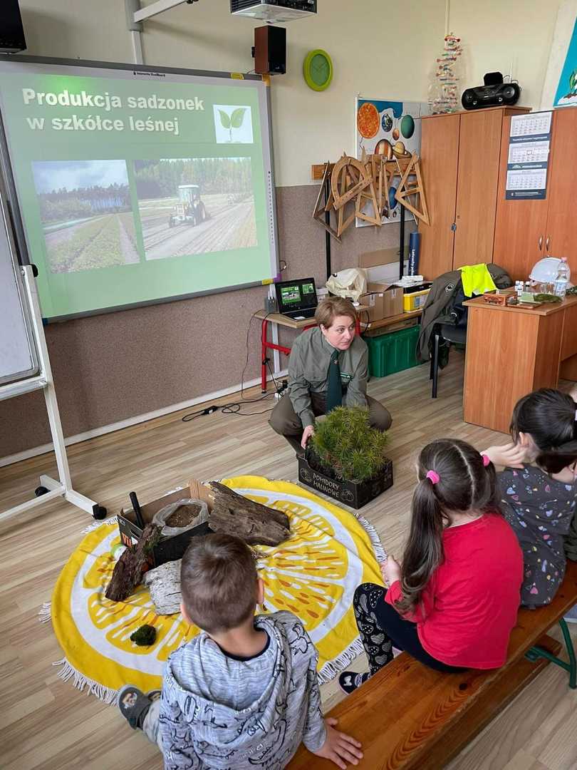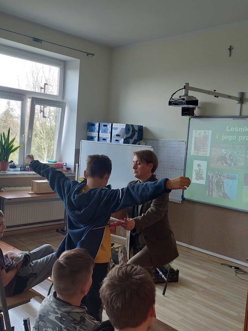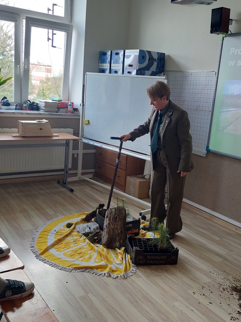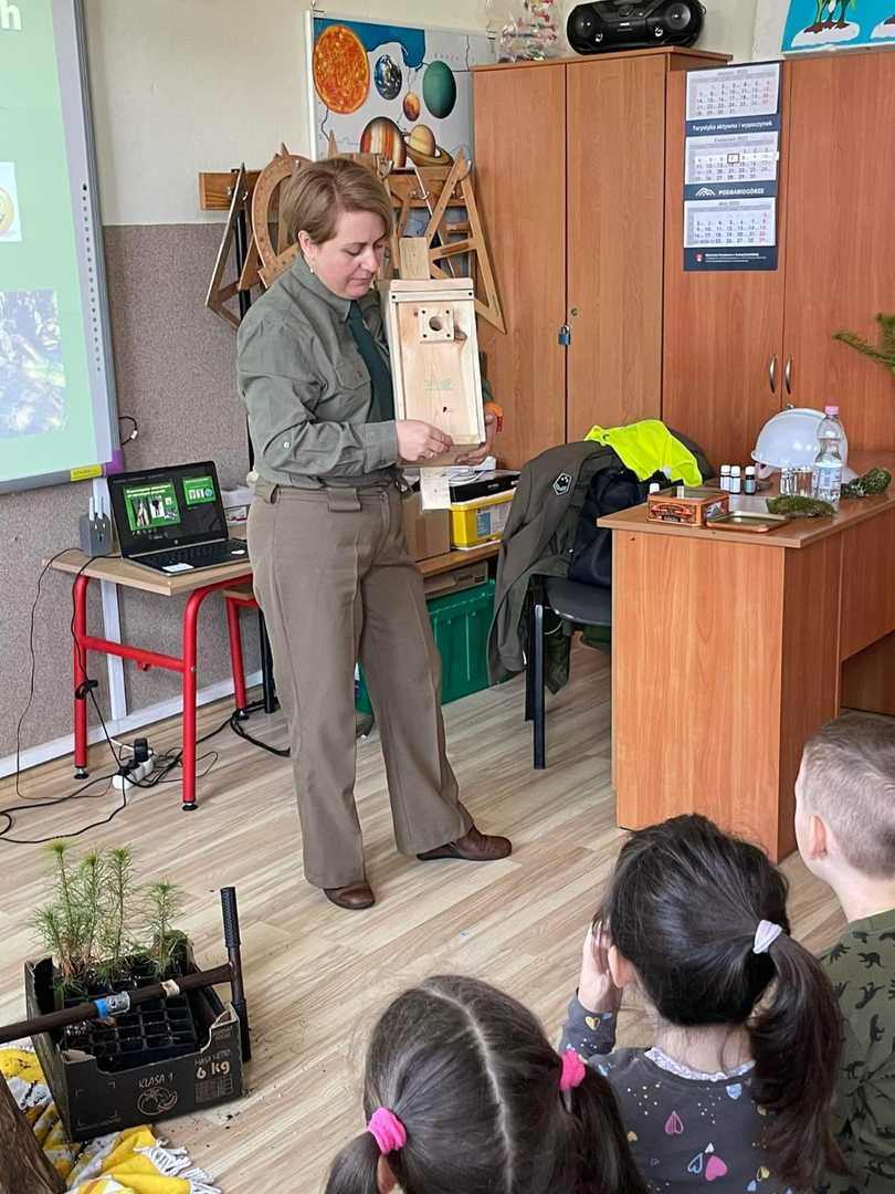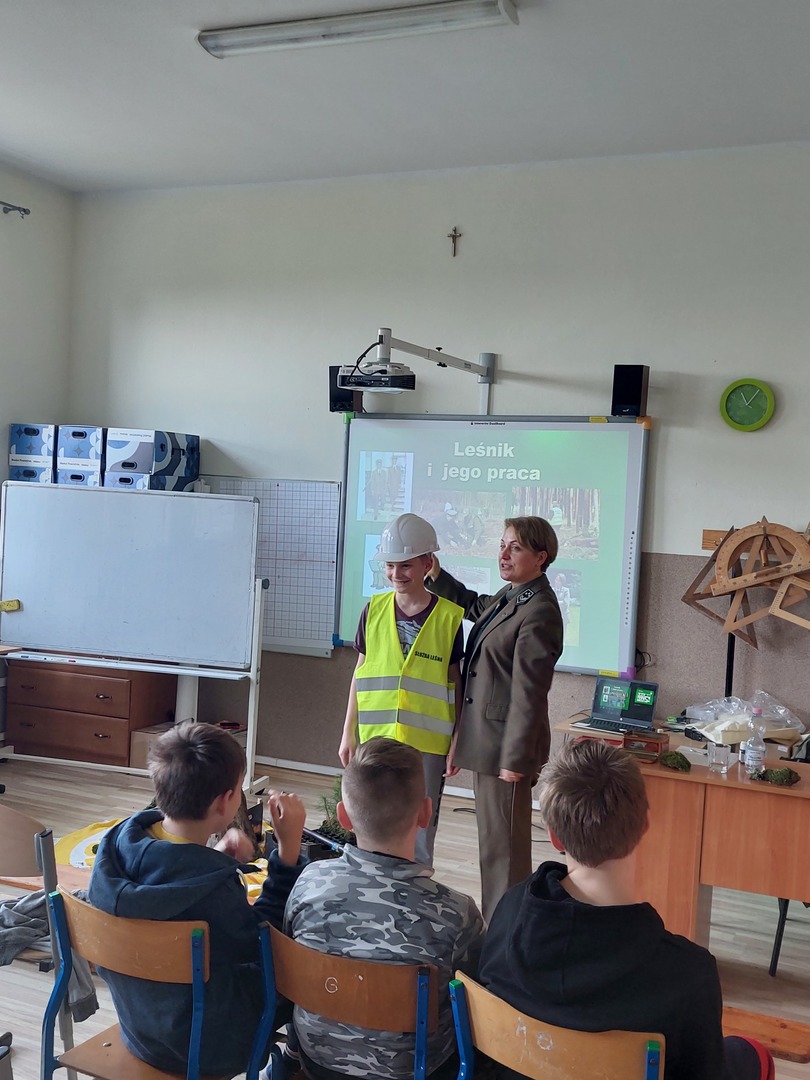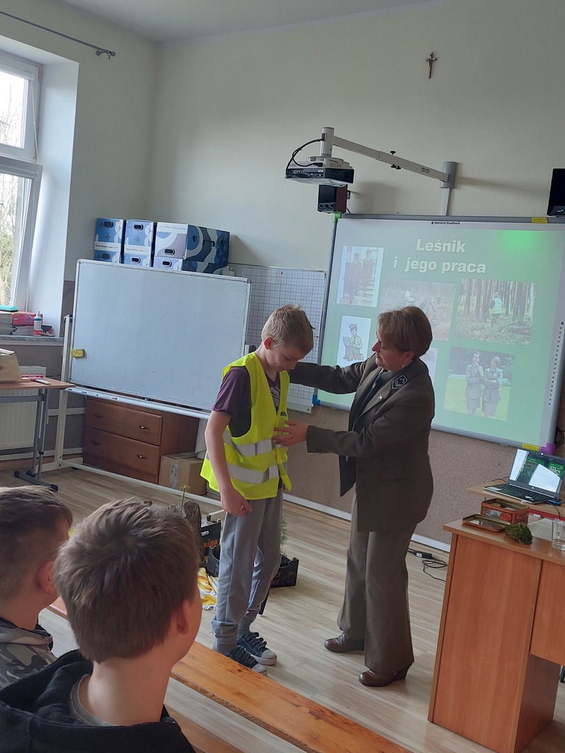 7 kwietnia 2022r. odwiedziła nas Pani Aleksandra Radomska- Barton z Leśnego Zakładu Doświadczeń w Siemianicach, która z wielkim entuzjazmem opowiedziała nam o swojej pracy- leśnika. Poznaliśmy zadania, które wykonuje na co dzień. Rozmawialiśmy również o zagrożeniach, które stwarza człowiek oraz o sposobach uniknięcia ich. Dowiedzieliśmy się także,że praca Pani Aleksandry jest Jej ogromną pasją i wykonuje ją z wielkim zaangażowaniem. Praca leśnika jest bardzo potrzebna i odpowiedzialna dla lasu oraz pośrednio dla nas.