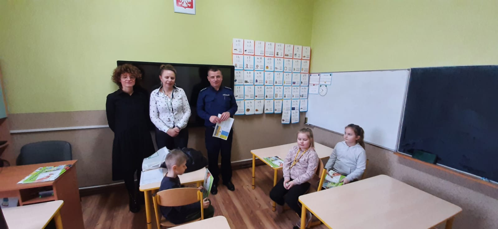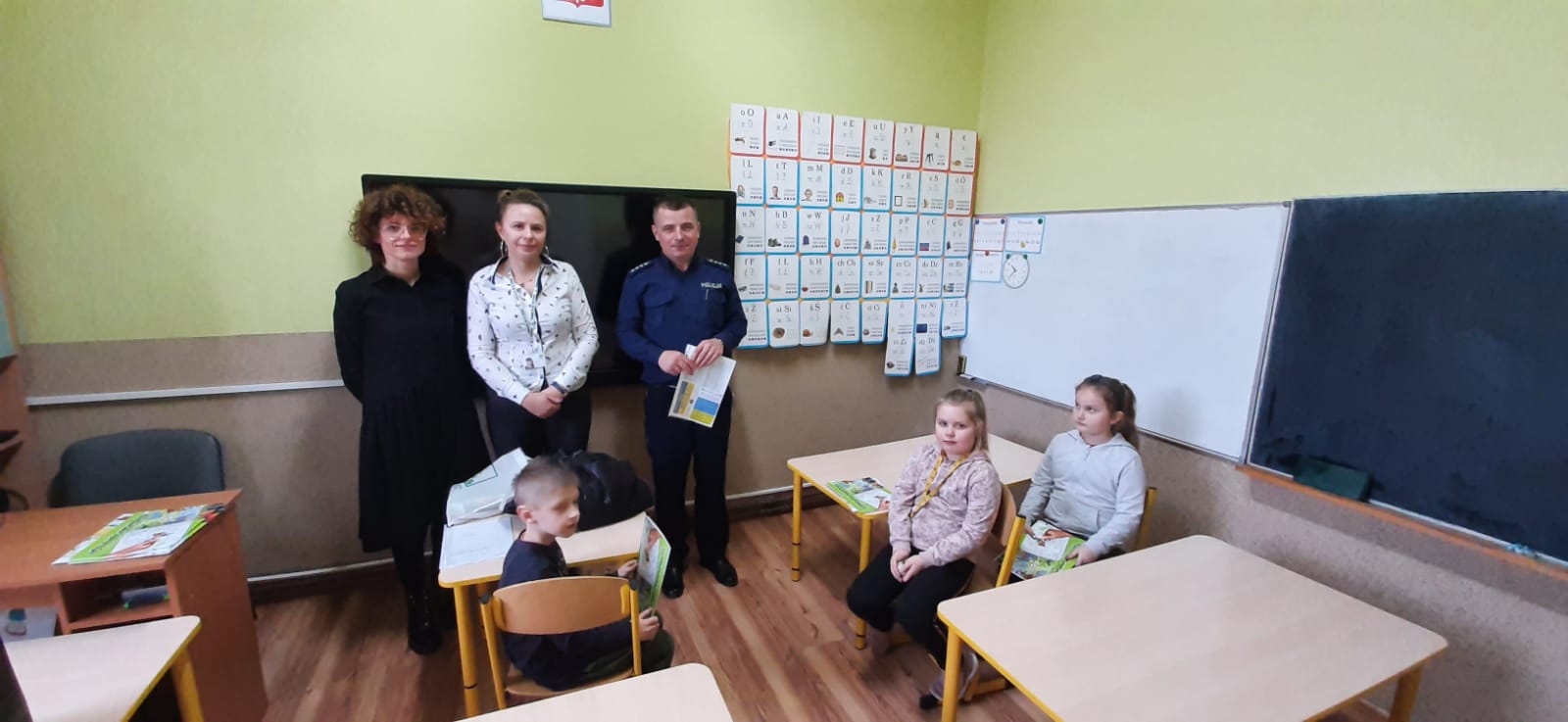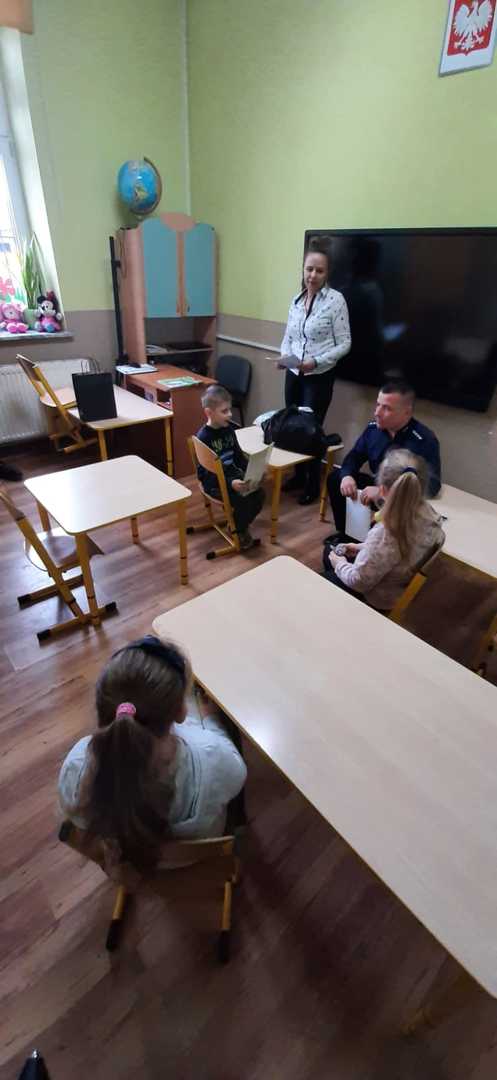 6 kwietnia 2022r. w naszej szkole odbyło się spotkanie edukacyjno- profilaktyczne dla klasy I z funkcjonariuszem policji, pracownikiem KRUS-u oraz Starostwa Powiatowego w Wieruszowie. W trakcie spotkania zostały poruszone kwestie bezpiecznego poruszania się po drogach, a także bezpieczeństwa na wsi w obrębie gospodarstw rolnych. Dzieci otrzymały kolorowanki oraz odblaski.