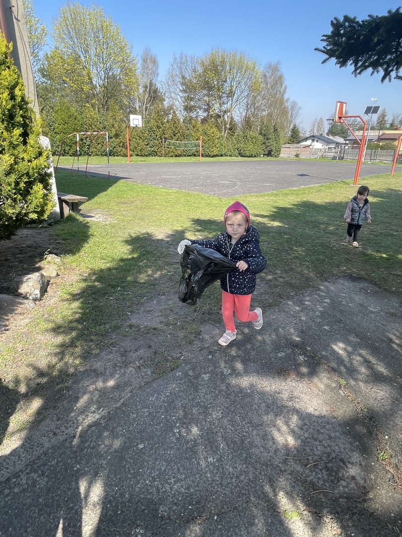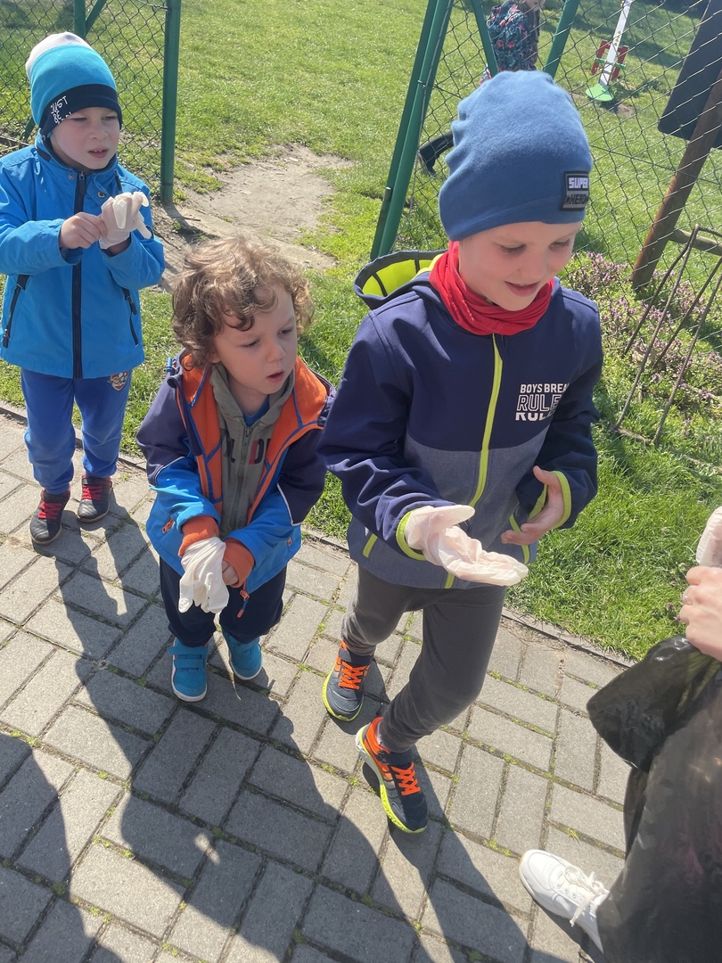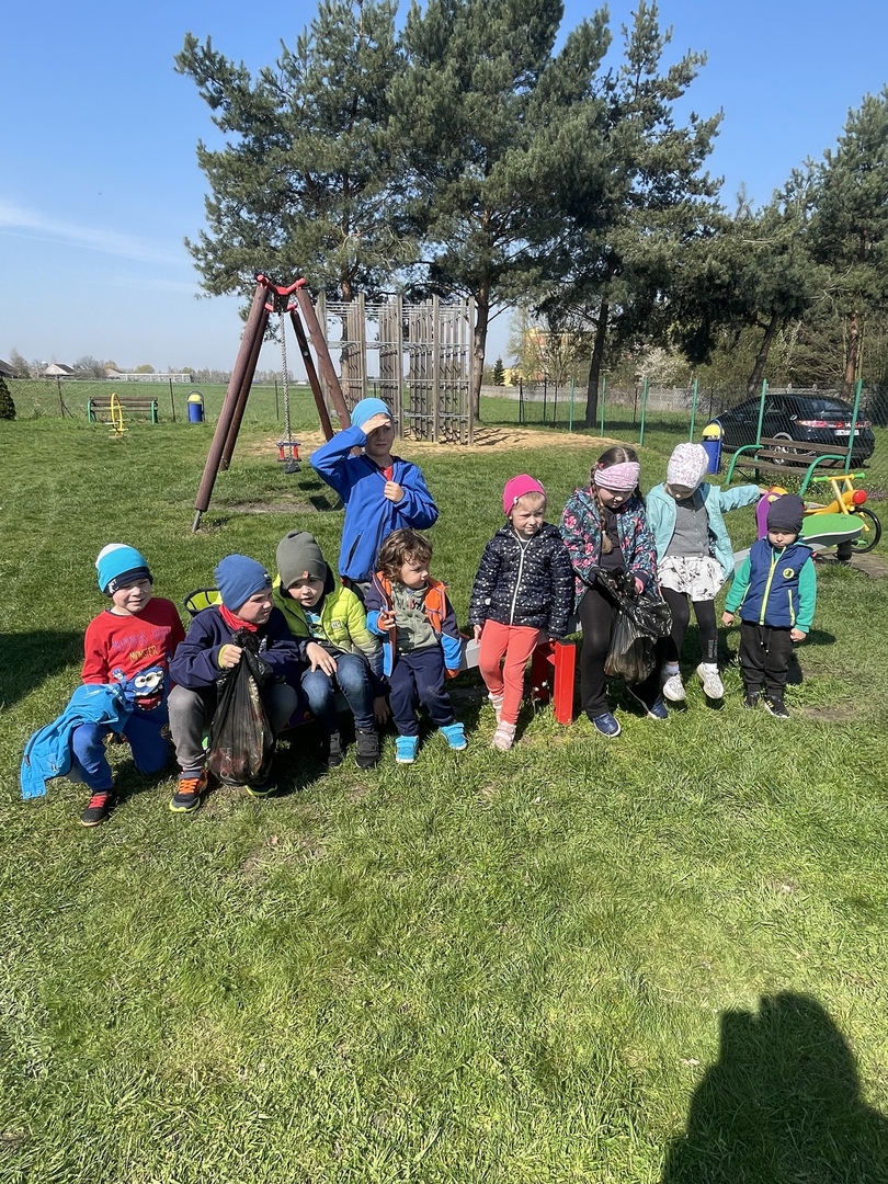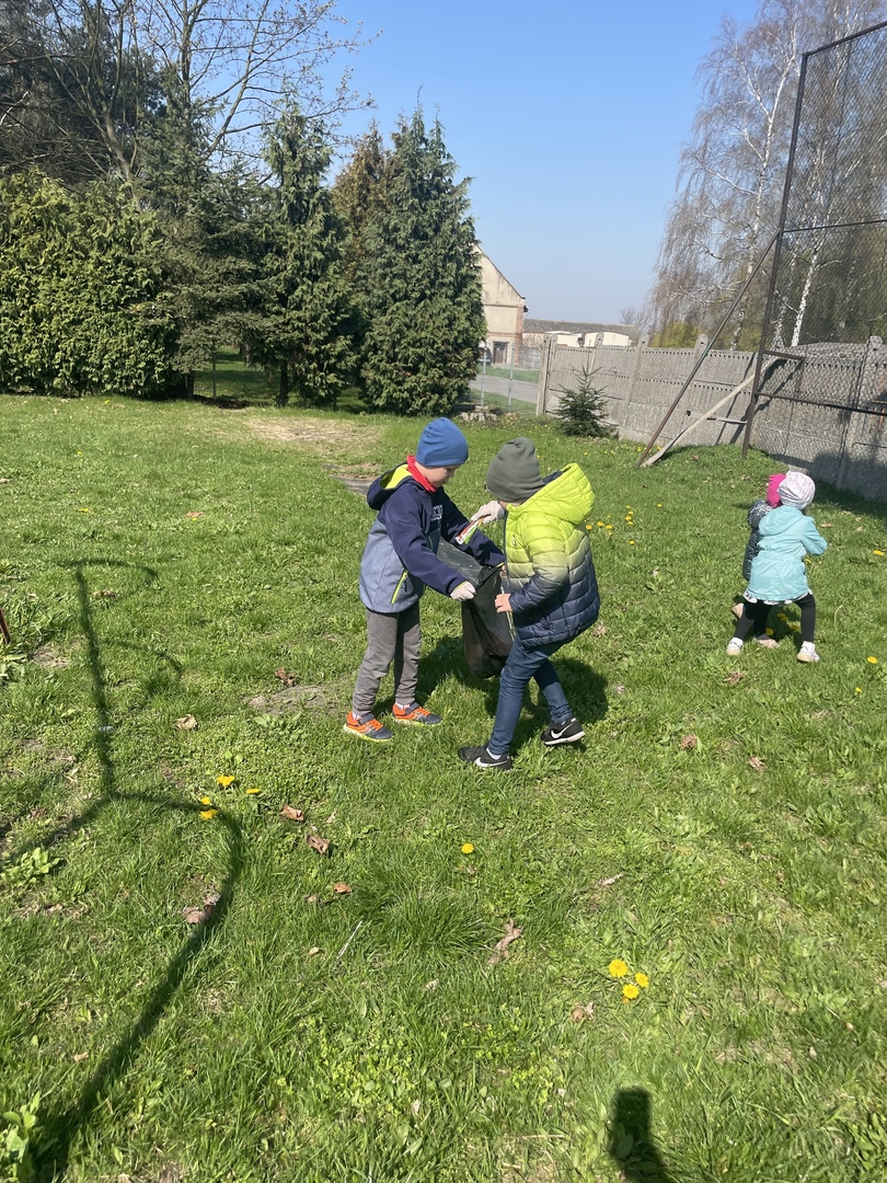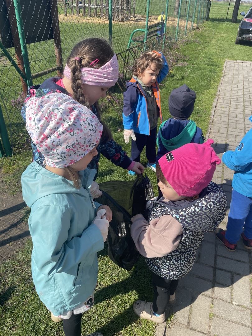 W piątkowe przedpołudnie 21.04.2023r. przedszkolaki posprzątały najbliższy teren wokół budynku szkoły. Każdy otrzymał jednorazową rękawiczkę i wyruszył w poszukiwaniu śmieci. Dzięki temu wokół przedszkola zrobiło się czysto i przyjemnie. Wiek przedszkolny to okres wzmożonej aktywności poznawczej i emocjonalnej. Dlatego już w tym wieku należy dziecku ukazać potęgę i piękno otaczającego świata, wzbudzić w dziecku pozytywne uczucia takie jak odpowiedzialność wobec siebie i przyrody. Głównym celem tej akcji było ukazanie dzieciom skutków zaśmiecania „świata”, wyjaśnienie konieczności ochrony środowiska, recyklingu. Mamy nadzieję, że w ten sposób zdobyte doświadczenia zaowocują w przyszłości dobrymi ekologicznymi nawykami.