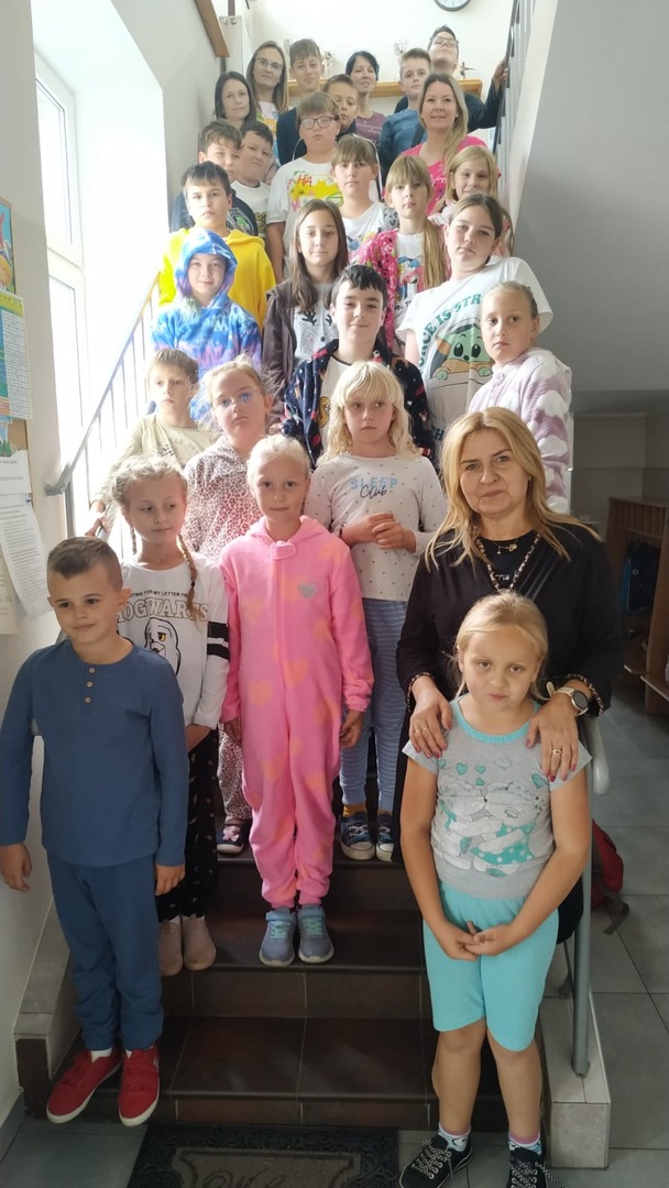 Dnia 05.10.2023r. Samorząd Uczniowski zorganizował ,, Dzień Piżamy"- dzień, w którym wszyscy bez wyjątku mogli przyjść i prezentować się w szkole w piżamie lub w szlafroku. Ten dzień to okazja nie tylko do tego, aby zapewnić społeczności szolnej powody do radości i dobrej zabawy, ale przede wszystkim symboliczny gest dla dzieci chorych onkologicznie, które w tym stroju spędzają na oddziele onkologii tygodnie, a nawet miesiące.