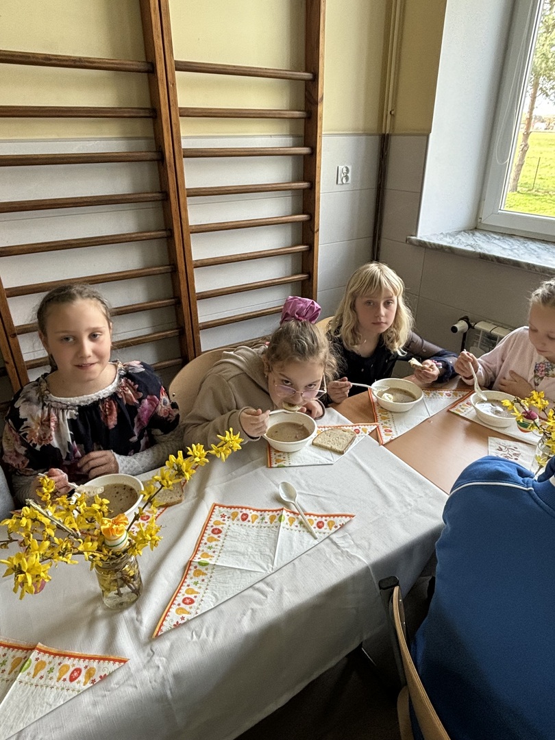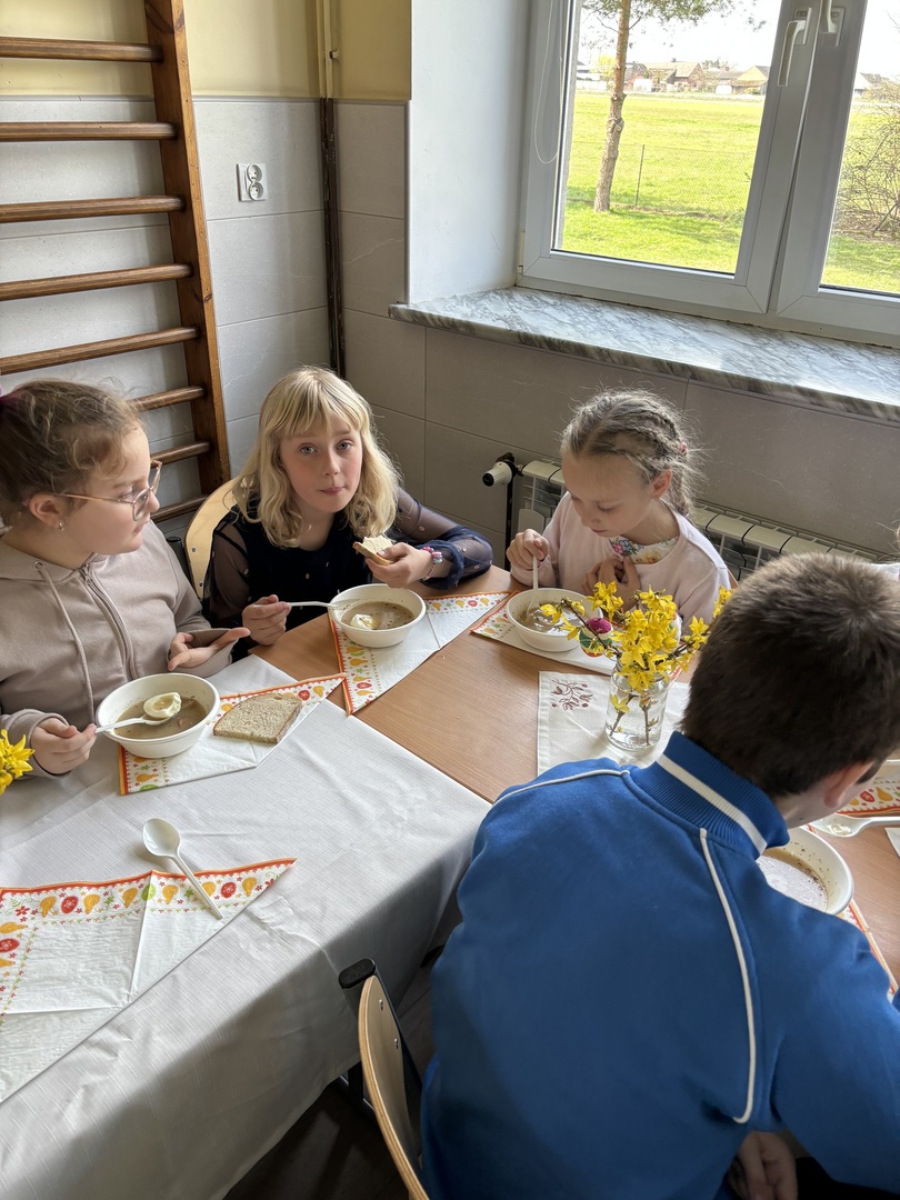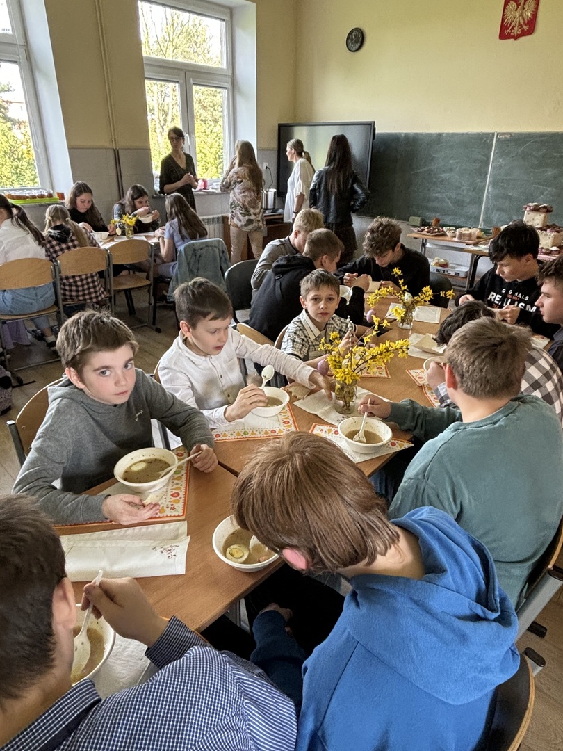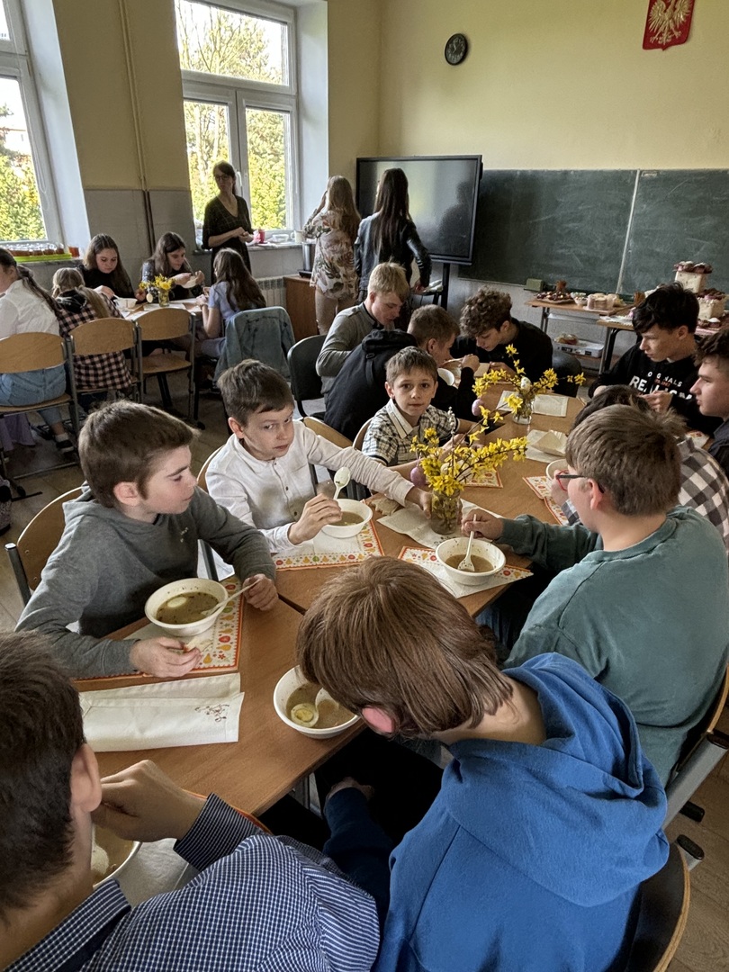 W środowy poranek 27 marca uczniowie i nauczyciele zasiedli do wspólnego śniadania wielkanocnego. Zjedli pyszny żurek, a na deser słodkości, które sami przgotowali. Klasy 1-3 wspólnie z p. Ewą upiekły smaczne muffiny. Dziewczyny z klasy 7 zrobiły czekoladowe gniazdka.