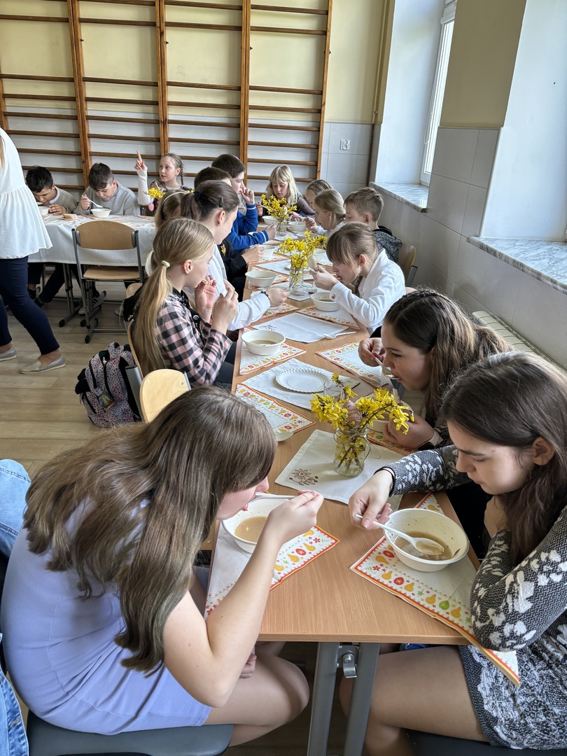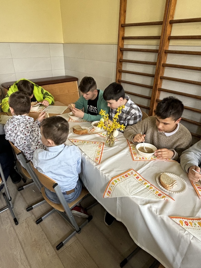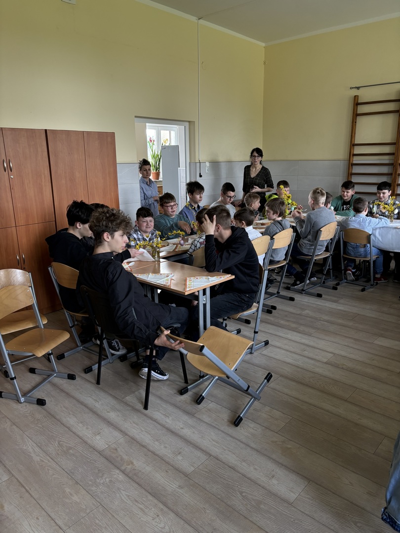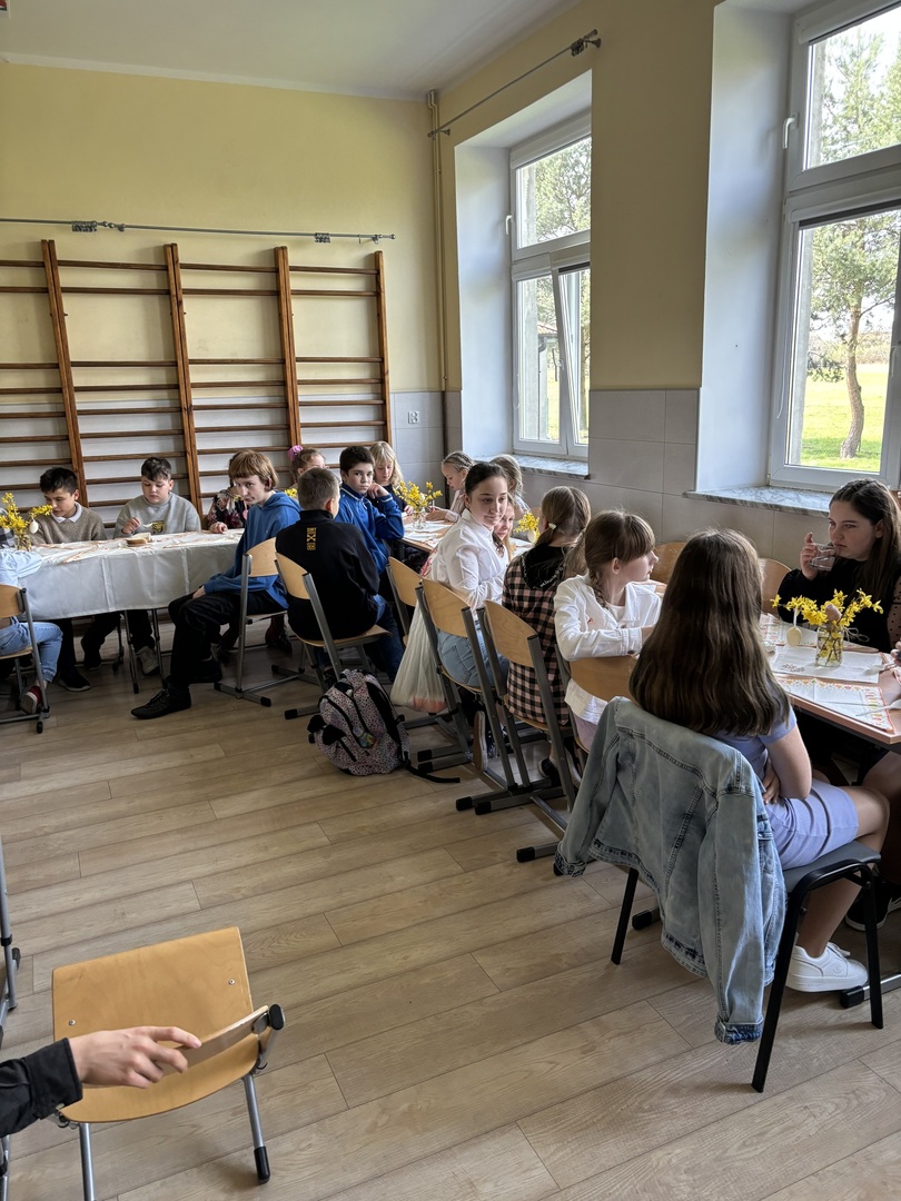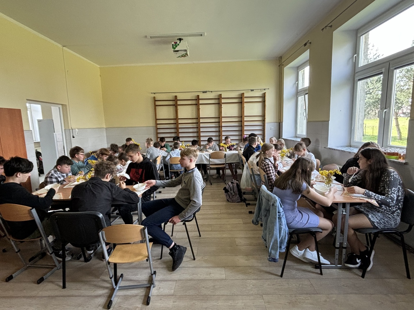 W środowy poranek 27 marca uczniowie i nauczyciele zasiedli do wspólnego śniadania wielkanocnego. Zjedli pyszny żurek, a na deser słodkości, które sami przgotowali. Klasy 1-3 wspólnie z p. Ewą upiekły smaczne muffiny. Dziewczyny z klasy 7 zrobiły czekoladowe gniazdka.