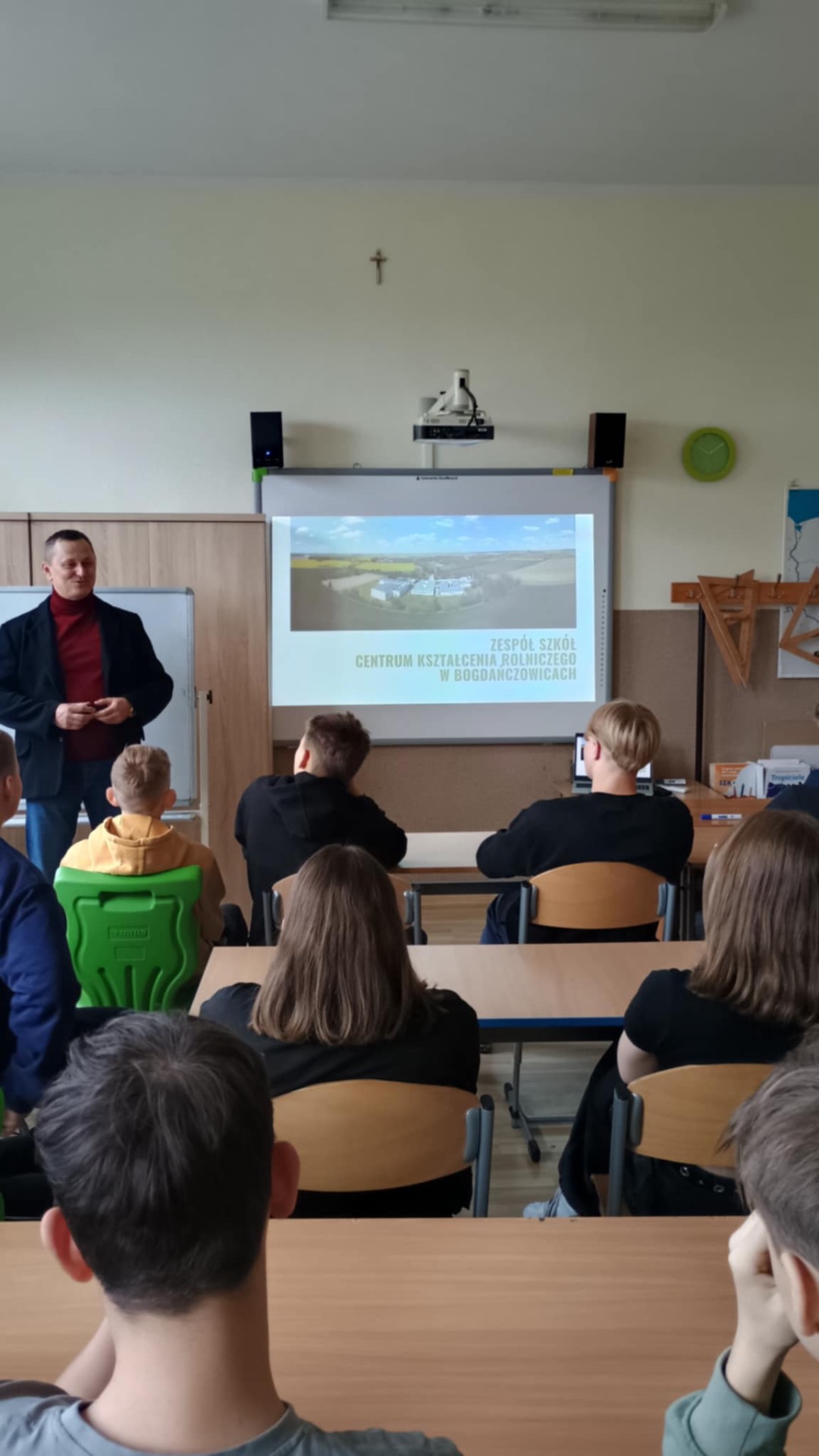 W dniu 07.04.2025r. w ramach doradztwa zawodowego, uczniowie klas 6, 7, 8 mieli okazję zapoznać się z ofertą Zespołu Szkół Centrum Kształcenia Rolniczego w Bogdańczowicach. Nauczyciel przedmiotów zawodowych wraz z naszą absolwentką zaprezentowali krótki film opowiadający o działalności szkoły. Uczniowie mieli okazję zapoznać się z bogatą ofertą placówki. Po prezentacji nauczyciel udzielił zainteresowanym wyczerpujących odpowiedzi.