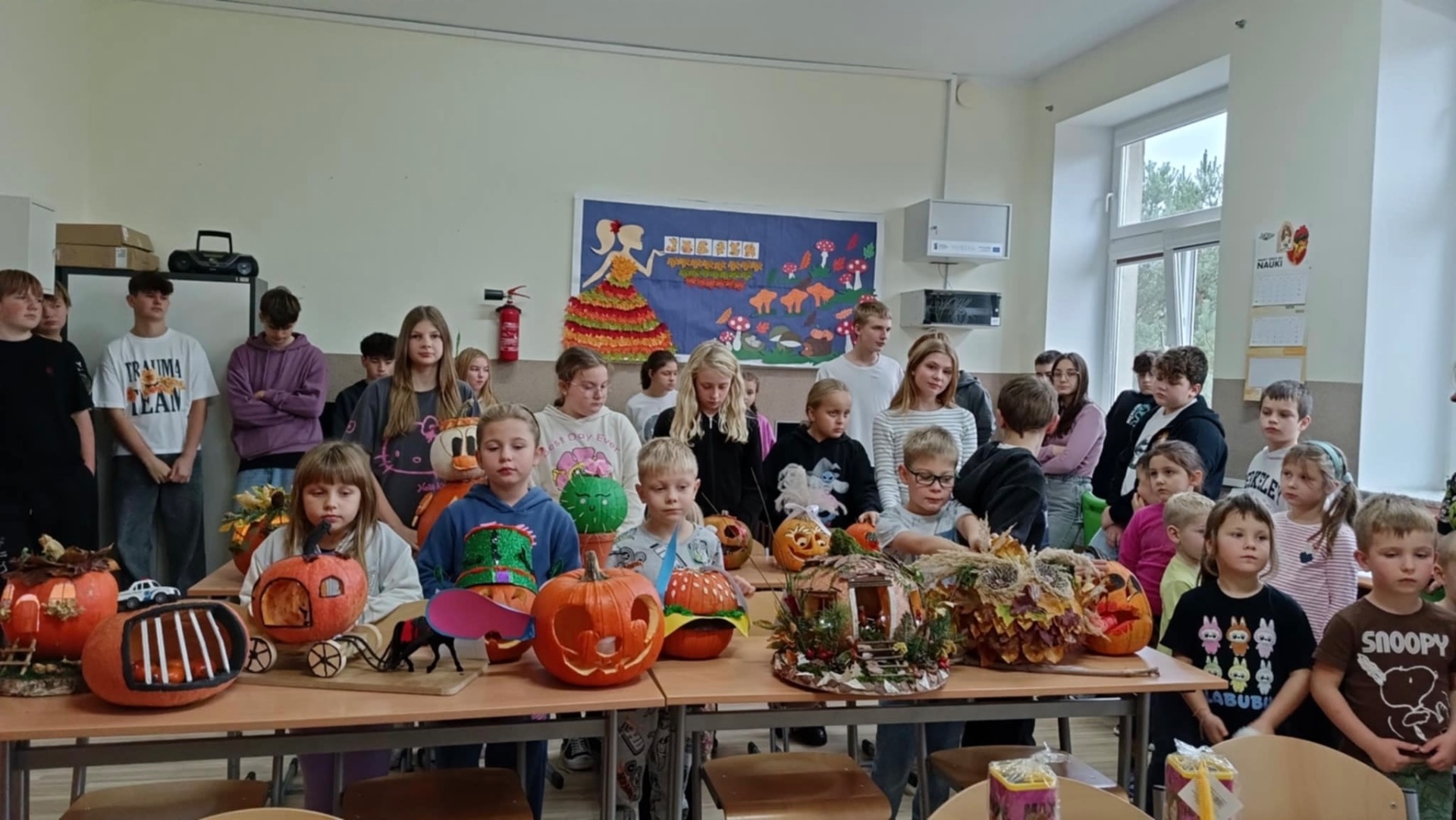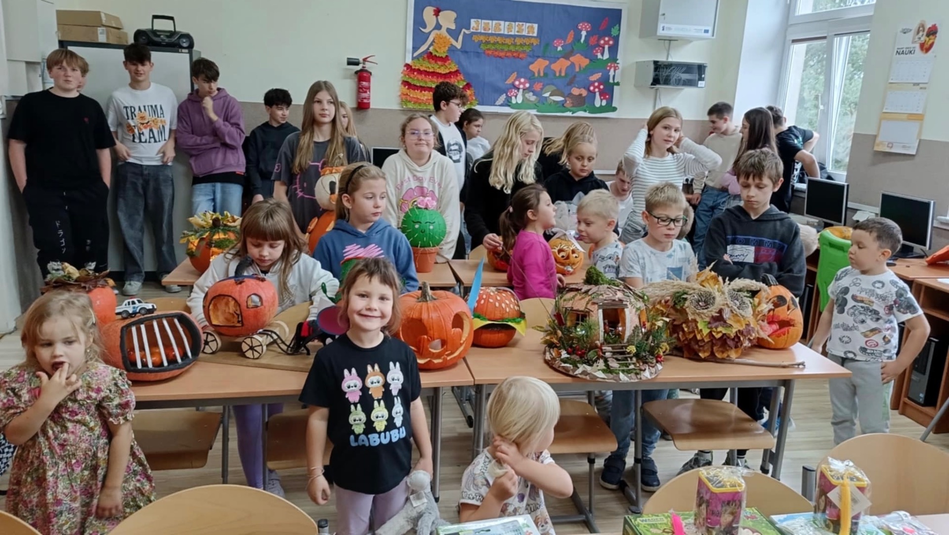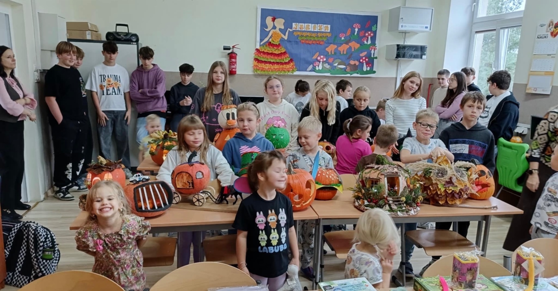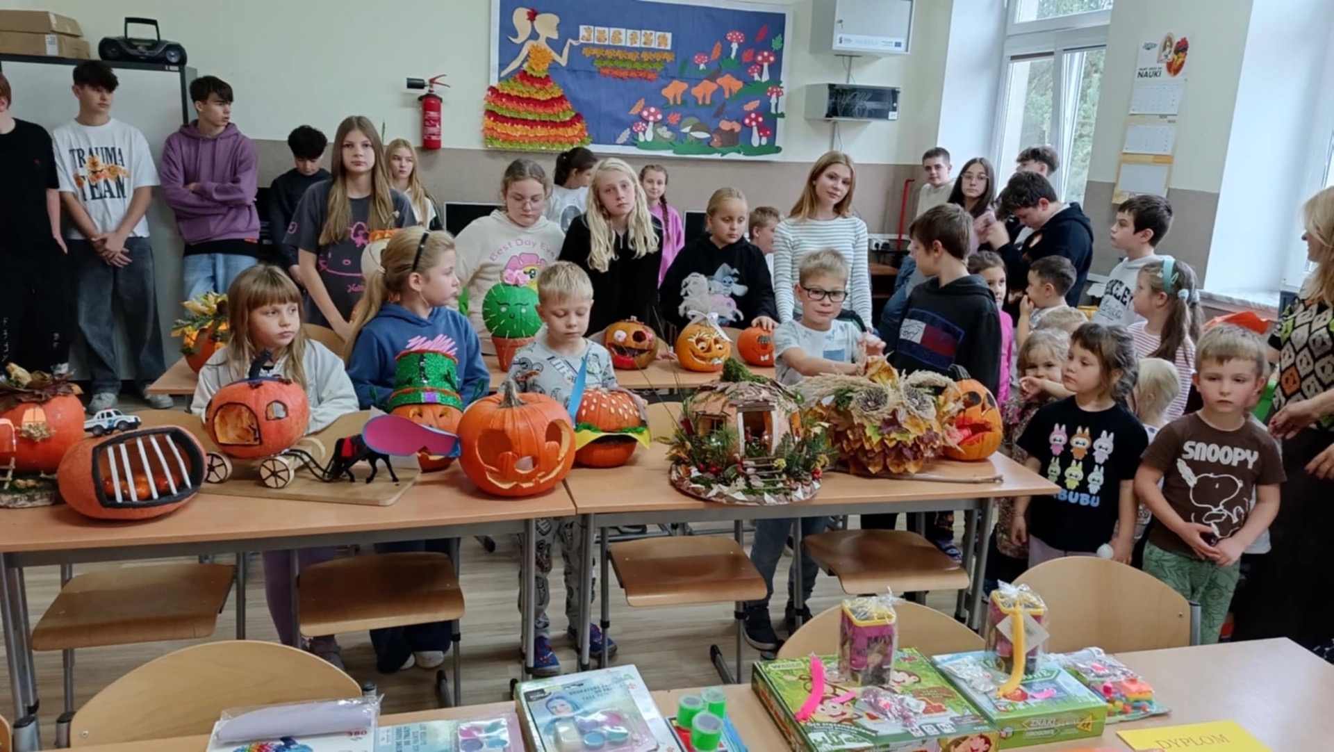 30 października 2025r. nastąpiło rozstrzygnięcie konkursu, na który wpłynęło 16 prac. Dzieci przygotowywały dynie wraz z rodzicami w domu. Wszystkie przyniesione do szkoły dynie prezentowały się rewelacyjnie! Nie brakowało różnorodnych pomysłów, od dyniowej kaczki, po czarownice, postacie z bajek, karoce, zwierzątka leśne, domki…
