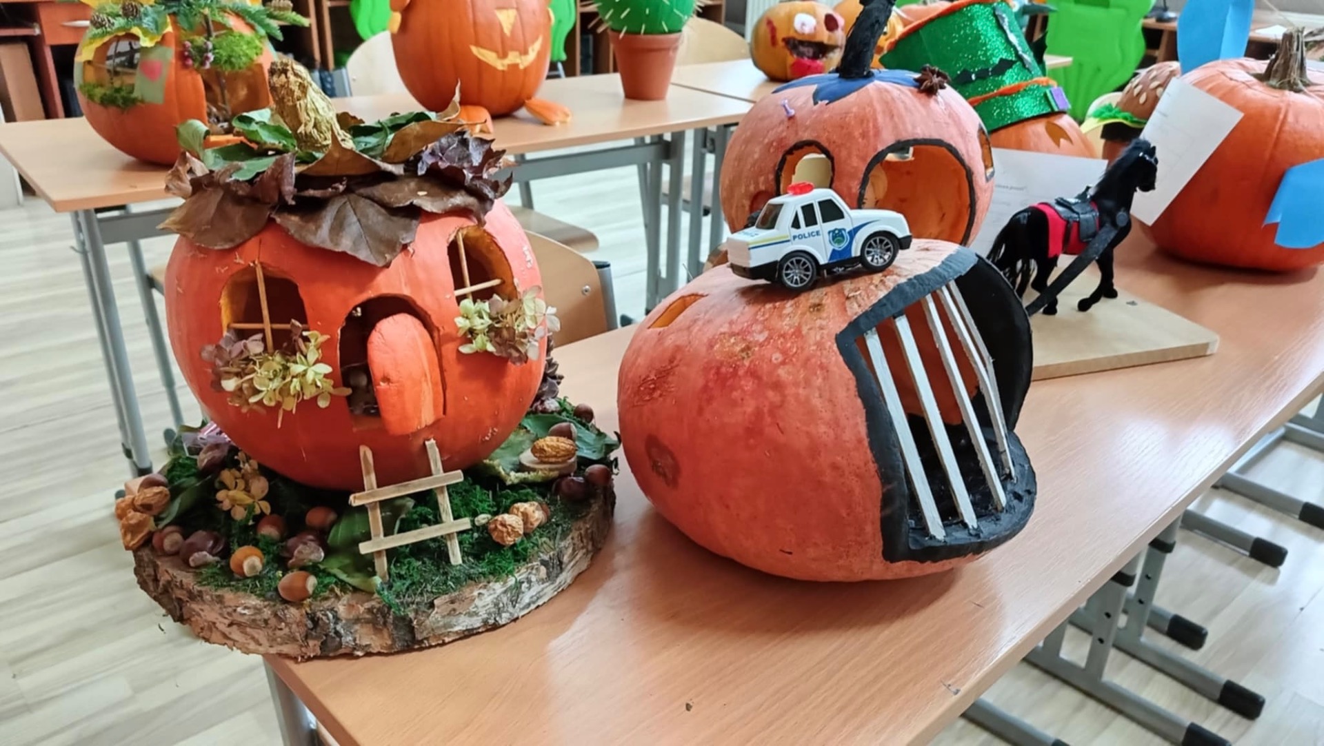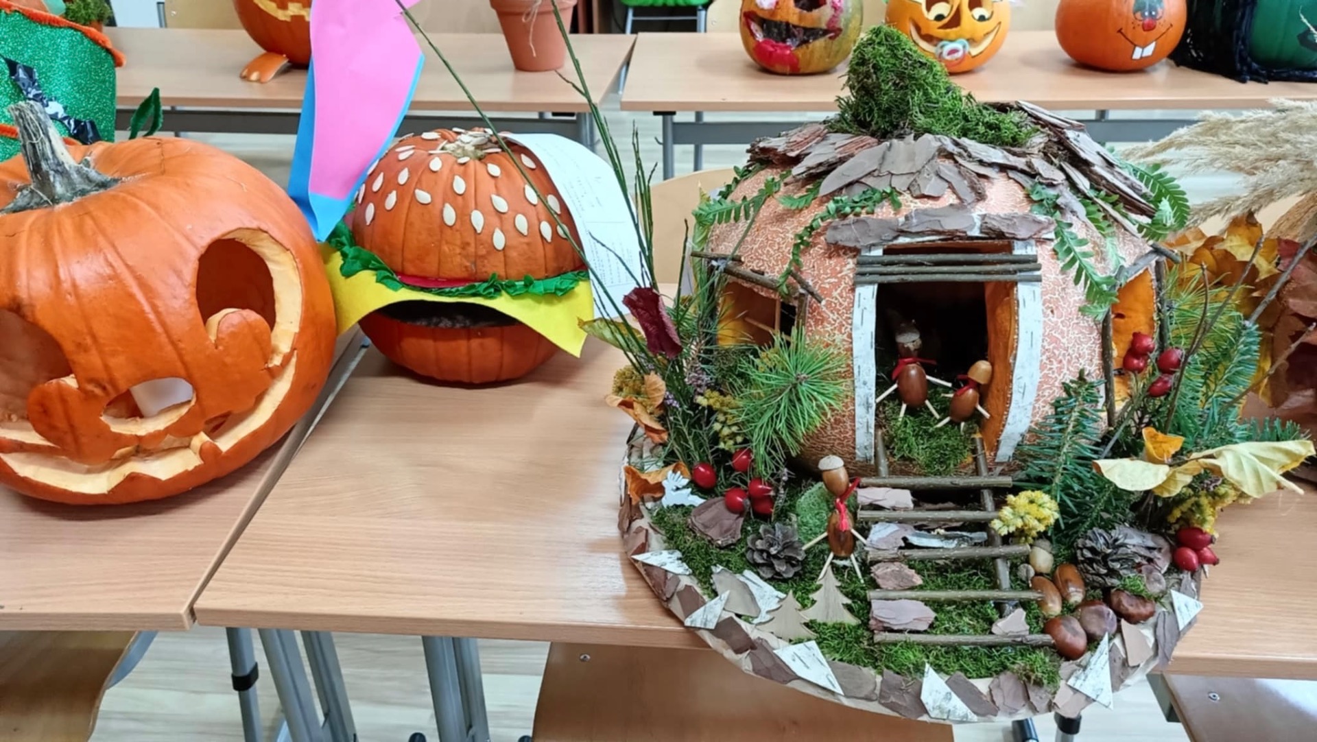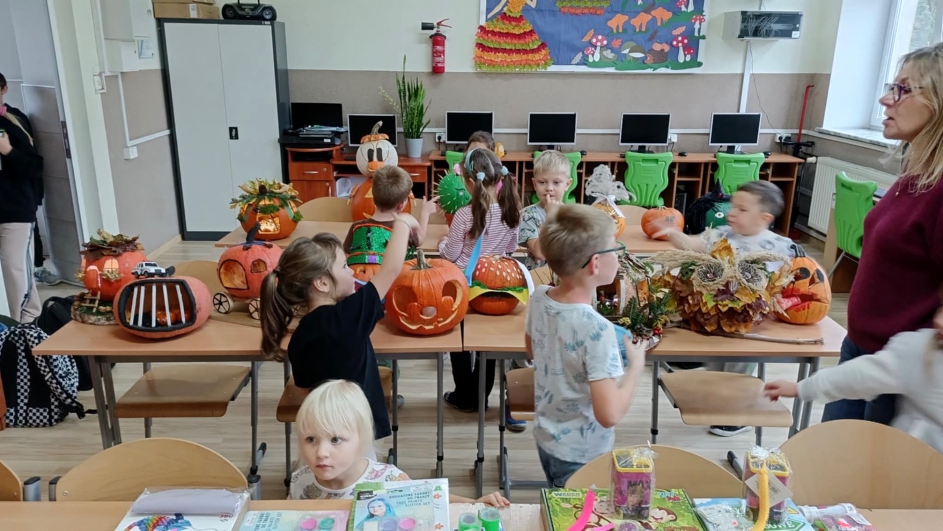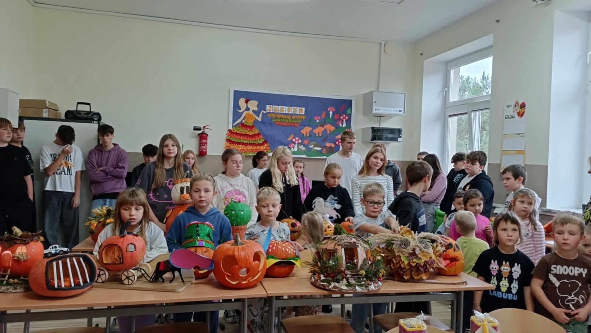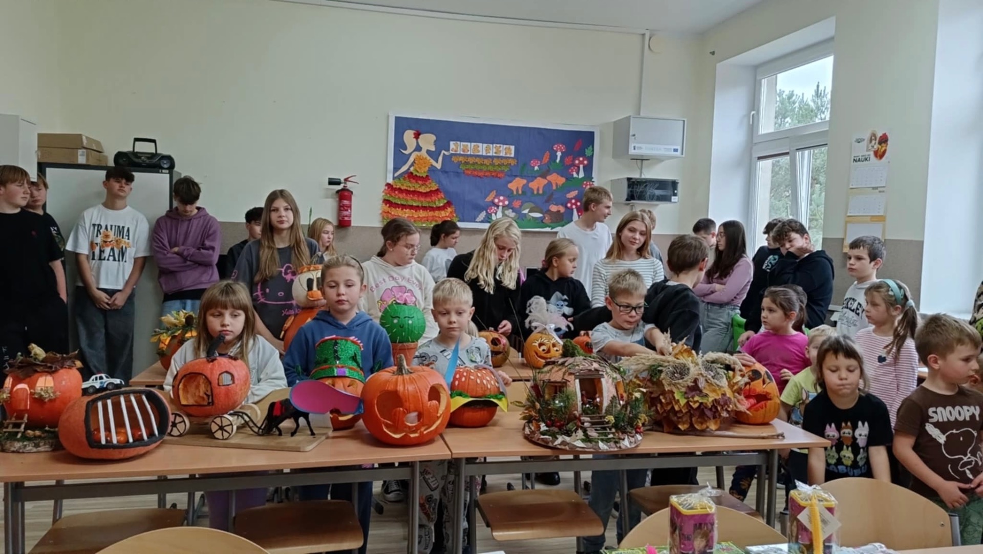 30 października 2025r. nastąpiło rozstrzygnięcie konkursu, na który wpłynęło 16 prac. Dzieci przygotowywały dynie wraz z rodzicami w domu. Wszystkie przyniesione do szkoły dynie prezentowały się rewelacyjnie! Nie brakowało różnorodnych pomysłów, od dyniowej kaczki, po czarownice, postacie z bajek, karoce, zwierzątka leśne, domki…