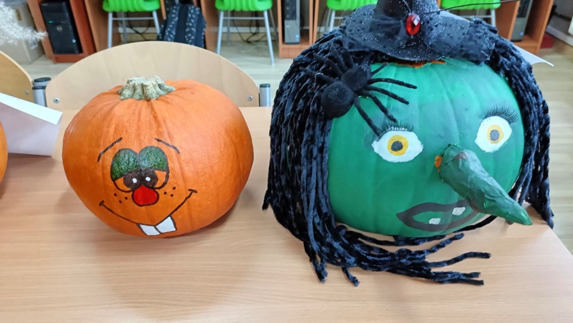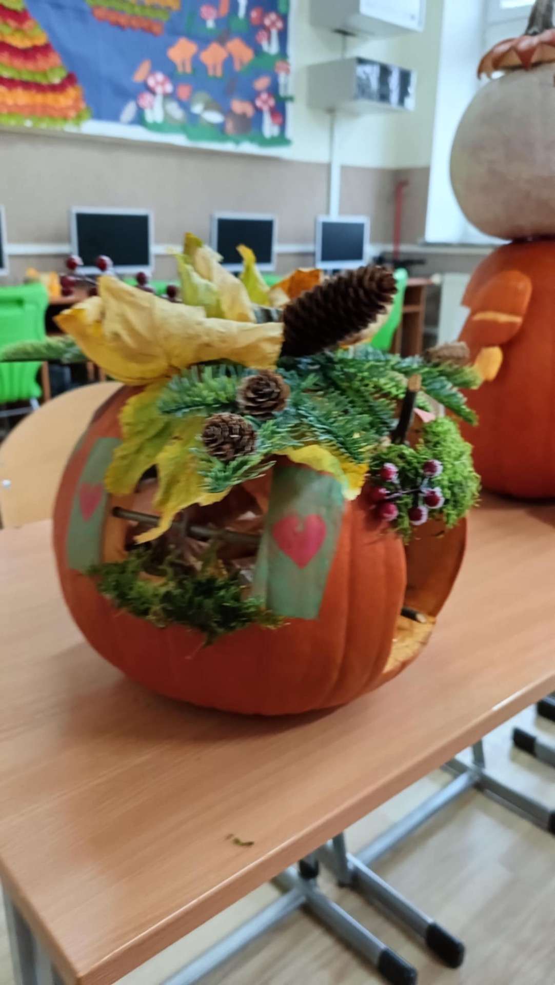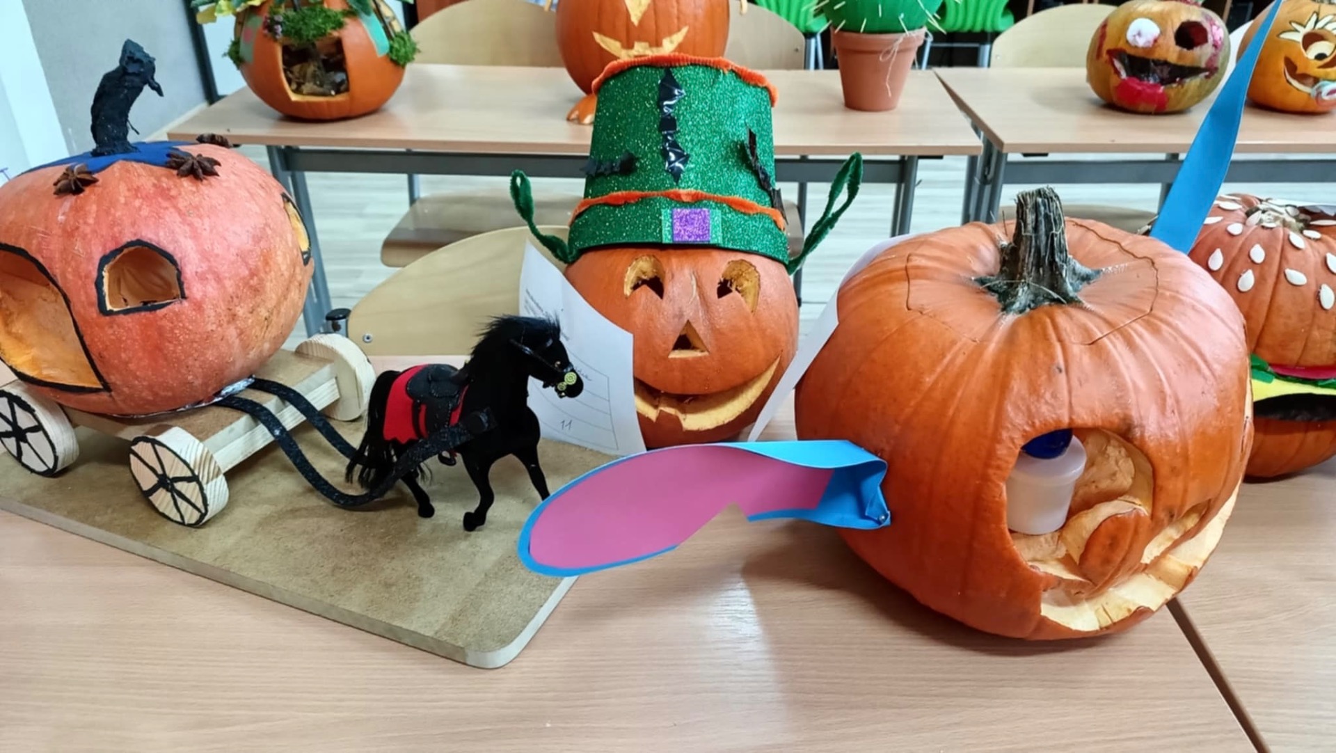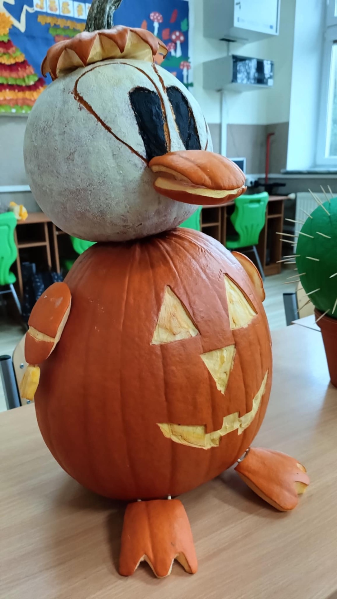 30 października 2025r. nastąpiło rozstrzygnięcie konkursu, na który wpłynęło 16 prac. Dzieci przygotowywały dynie wraz z rodzicami w domu. Wszystkie przyniesione do szkoły dynie prezentowały się rewelacyjnie! Nie brakowało różnorodnych pomysłów, od dyniowej kaczki, po czarownice, postacie z bajek, karoce, zwierzątka leśne, domki…