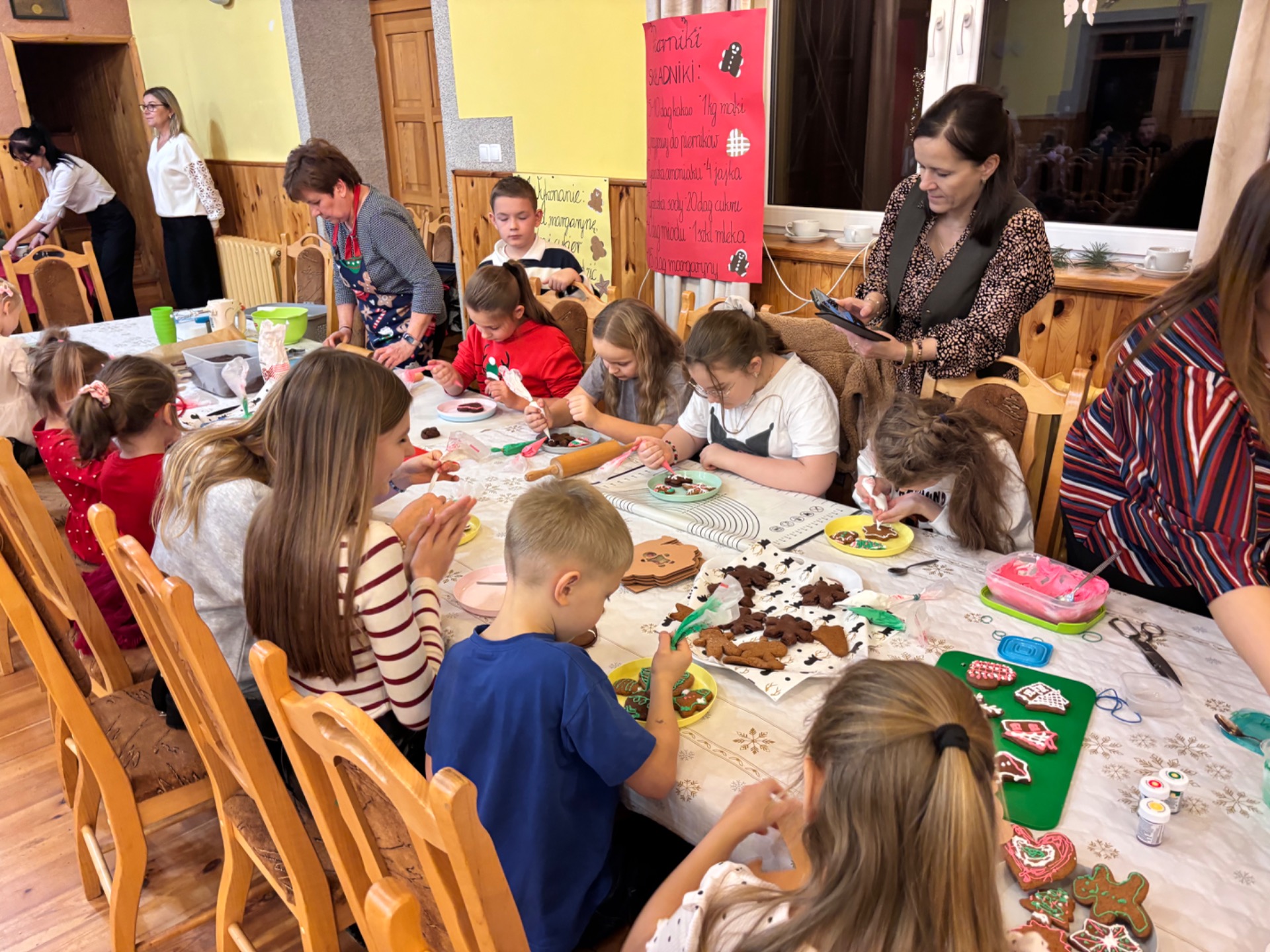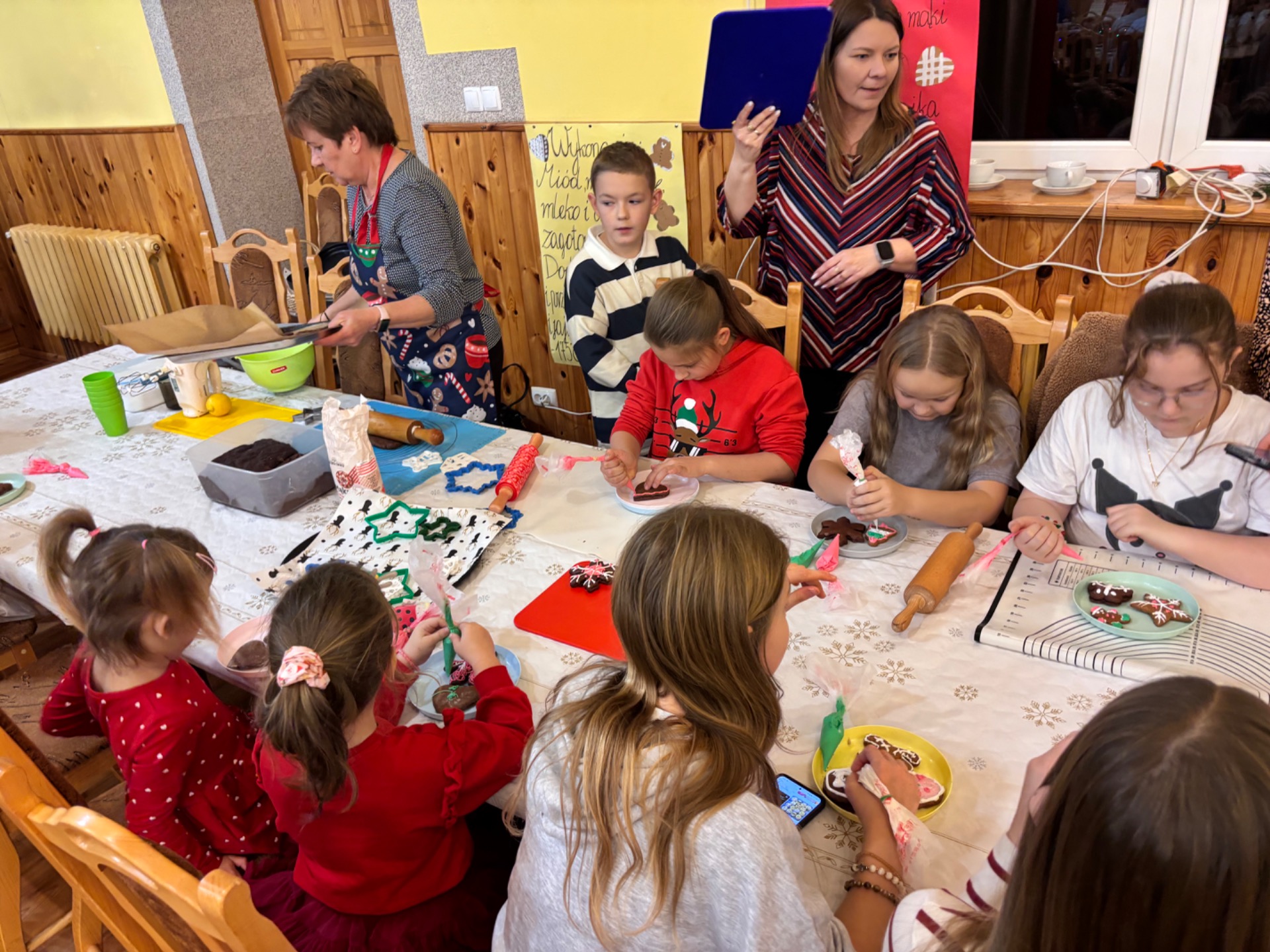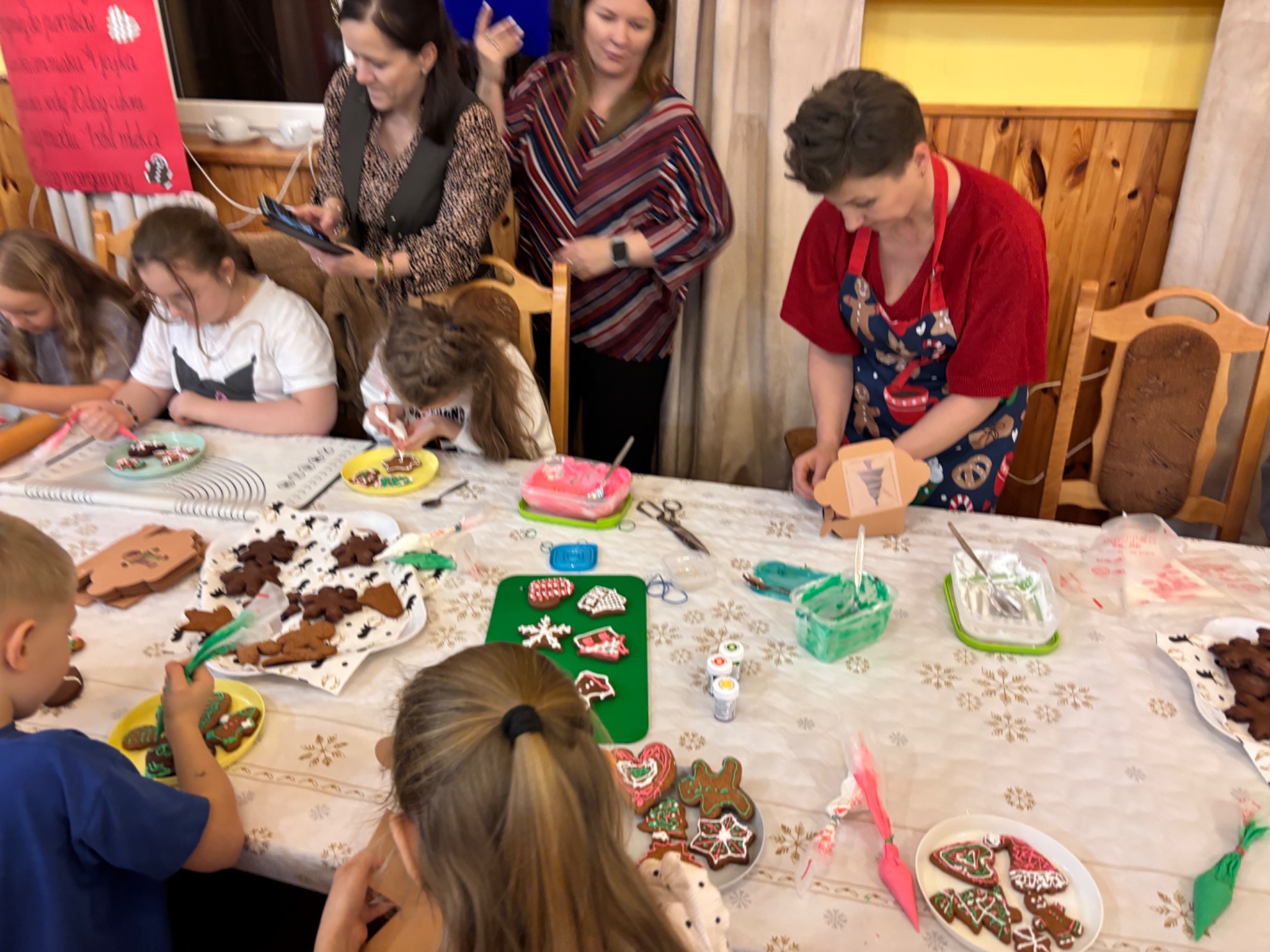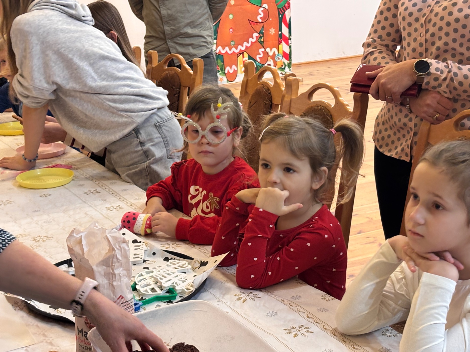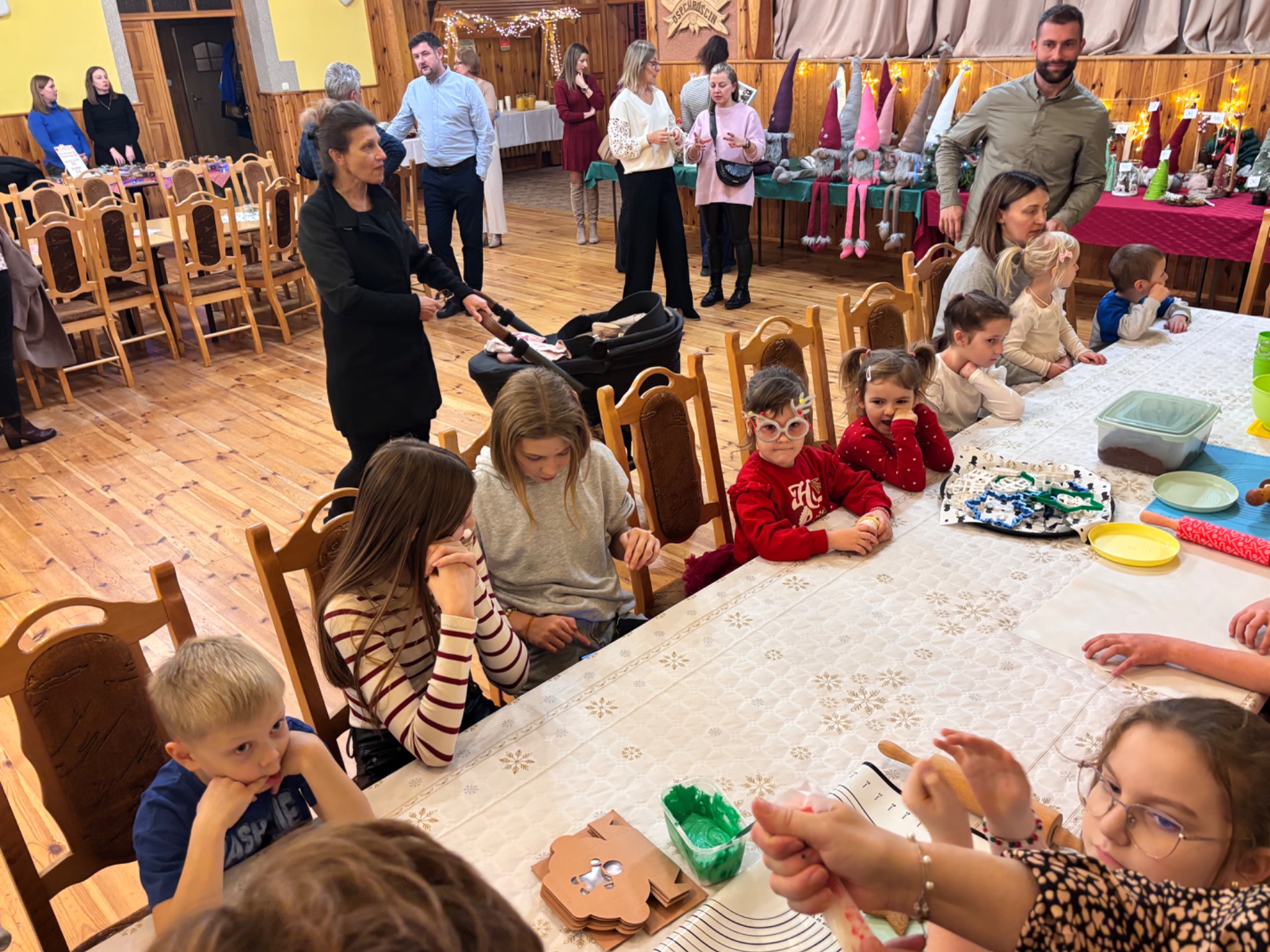 Z kolei ogromnych zainteresowaniem wśród najmłodszych gości cieszyły się warsztaty piernikowe, prowadzone przez Panią Basię i Panią Maritę. Dzieciaki z wielką pieczołowitością wycinały pierniki, które po upieczeniu własnoręcznie dekorowały, tworząc pyszne, pachnące dzieła sztuki. Najładniejsze zostały wystawione do konkursu, zaśnad jego rozstrzygnięciem pocił się nie kto inny, jak sam Mikołaj, który pojawił się na miejscu, aby obdarować dzieciaki i dorosłych słodkimi upominkami. Co odważniejsi nie odmówili sobie również pamiątkowego zdjęcia z przemiłym gościem.