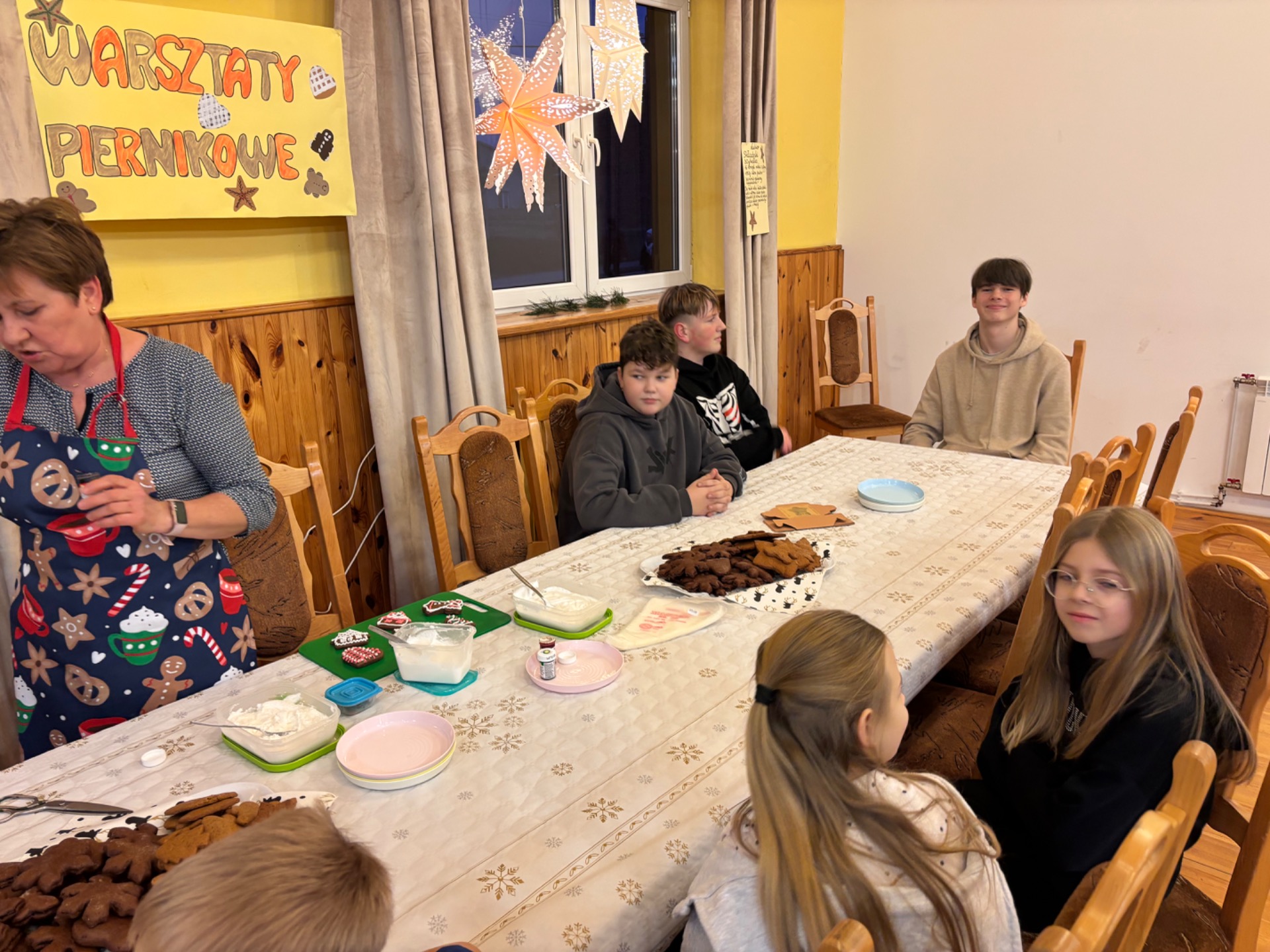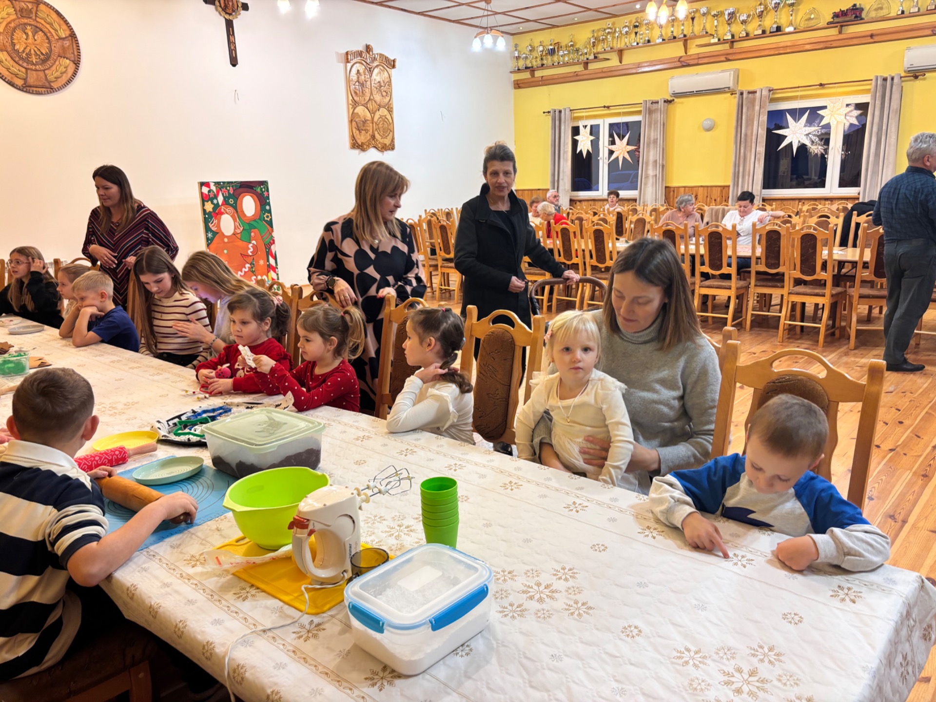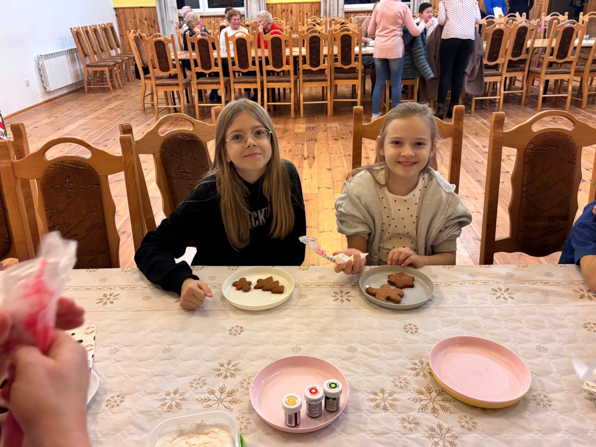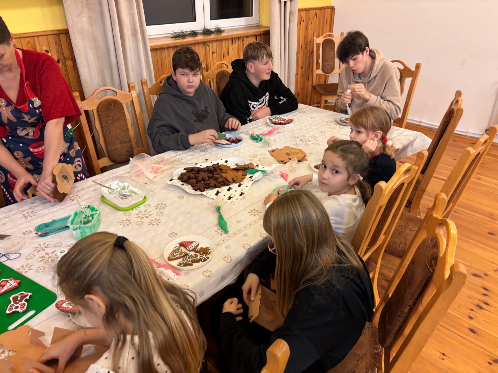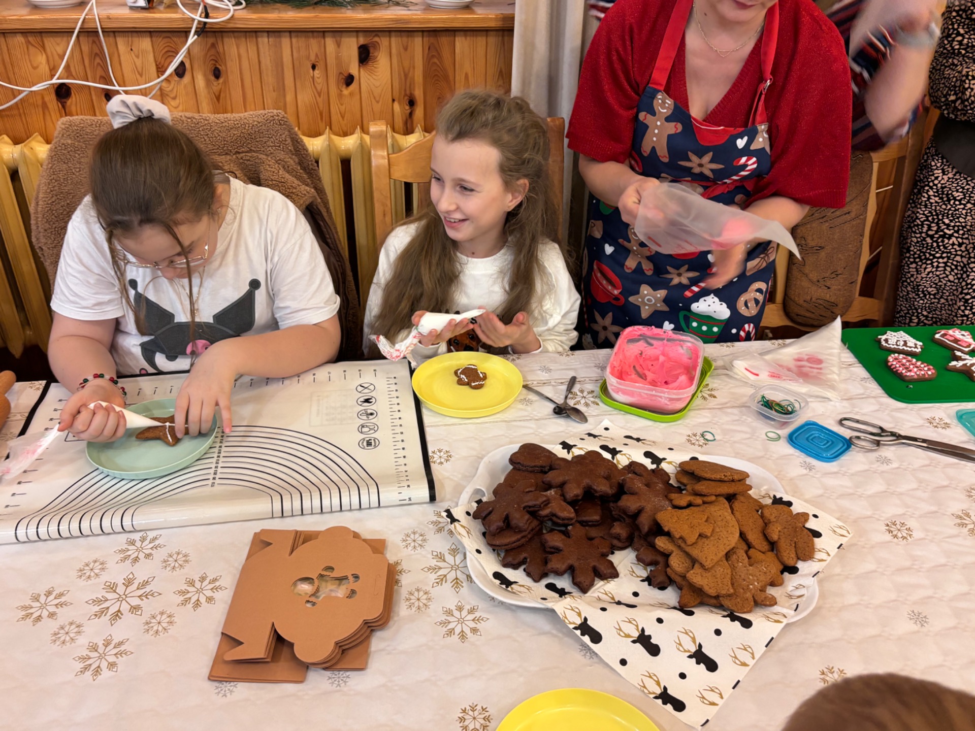 Z kolei ogromnych zainteresowaniem wśród najmłodszych gości cieszyły się warsztaty piernikowe, prowadzone przez Panią Basię i Panią Maritę. Dzieciaki z wielką pieczołowitością wycinały pierniki, które po upieczeniu własnoręcznie dekorowały, tworząc pyszne, pachnące dzieła sztuki. Najładniejsze zostały wystawione do konkursu, zaśnad jego rozstrzygnięciem pocił się nie kto inny, jak sam Mikołaj, który pojawił się na miejscu, aby obdarować dzieciaki i dorosłych słodkimi upominkami. Co odważniejsi nie odmówili sobie również pamiątkowego zdjęcia z przemiłym gościem.
